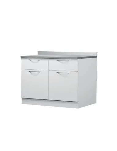 El conjunto mobiliario auxiliar de Zilfor es un mueble construido en chapa de acero galvanizado pintado en blanco con encimera de acero inoxidable para colocar aparatos y aprovechar al máximo el espacio en su laboratorio dental.