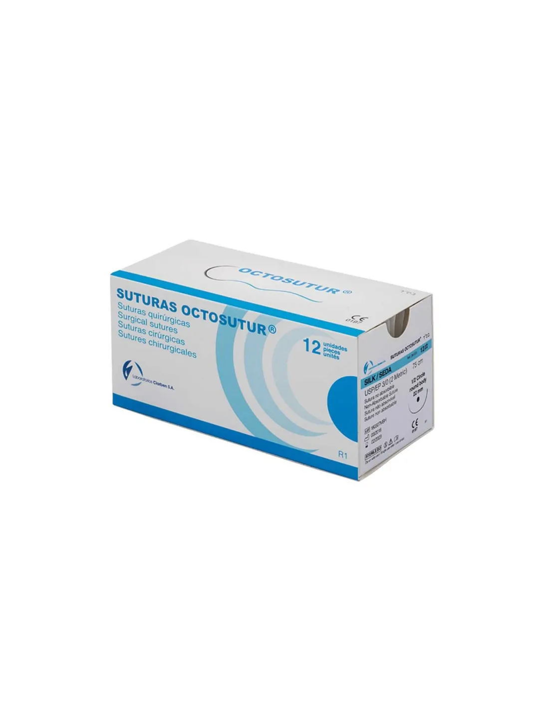 La caja de Octosutur sutura de seda aguja 1/2 triangular de Clarben contiene 12 unidades, a elegir USP entre los disponibles.
