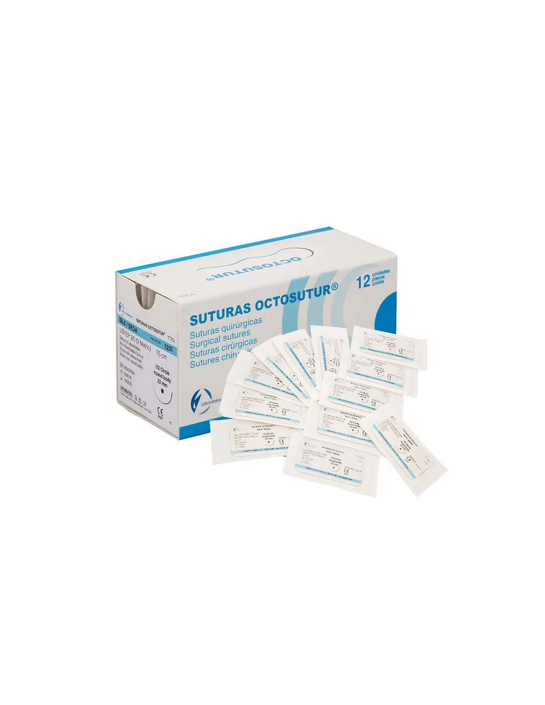 La caja de Octosutur sutura quirúrgica de USP 5/0 con aguja 3/8 triangular de 19mm y hebra de 45cm de Clarben contiene 12 unidades.