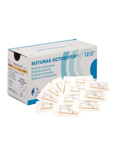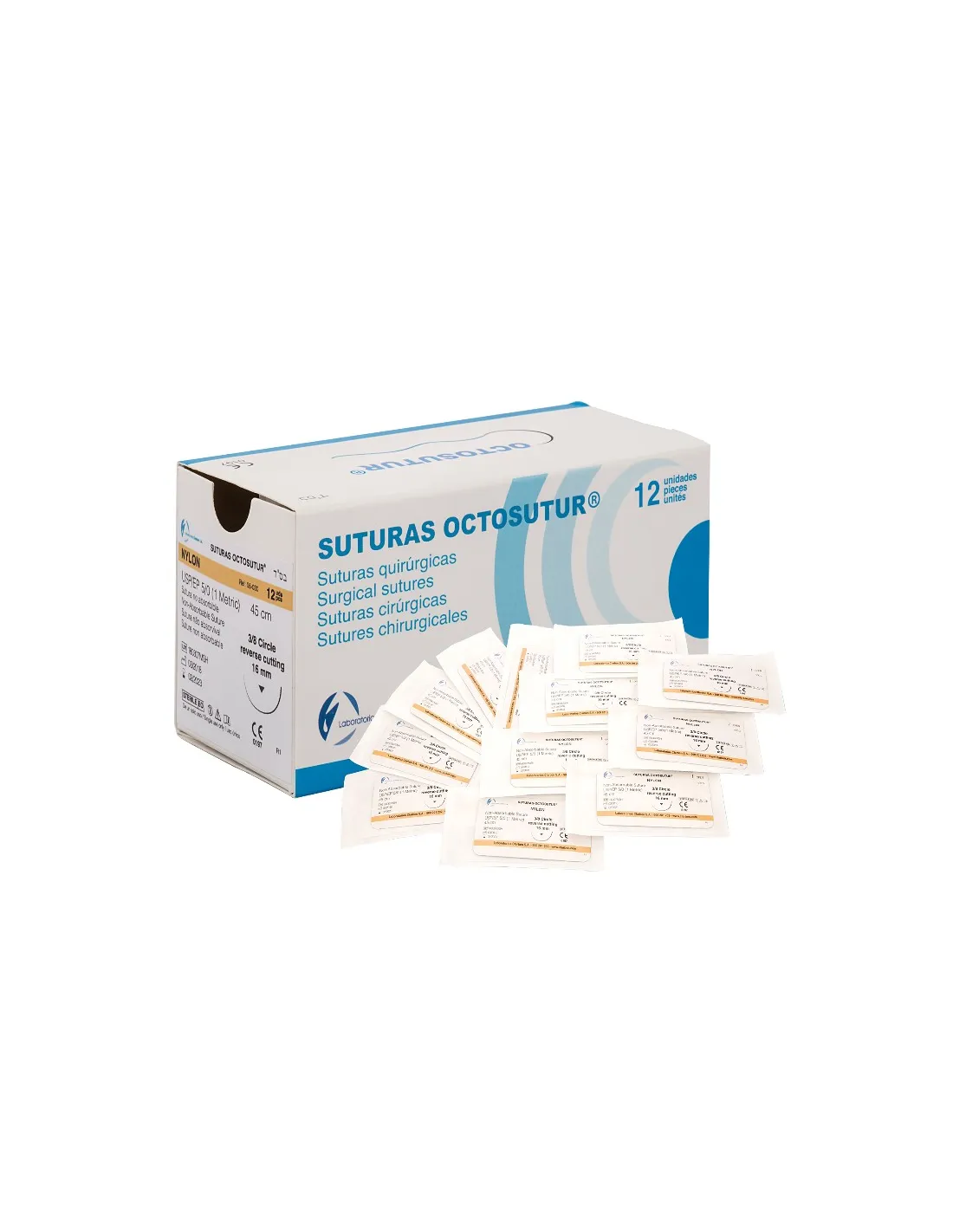 La caja de Octosutur sutura de nylon aguja 3/8 triangular USP 5/0 de 16mm y hebra de 45cm de Clarben contiene 12 unidades.