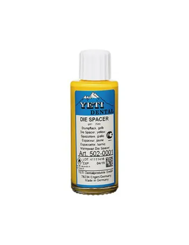 El Barniz espaciador Die Spacer de Yeti Dental se presenta en una botella de 20ml, color amarillo.