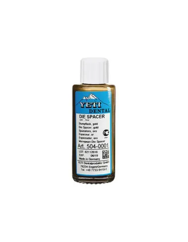 El Barniz espaciador Die Spacer 13 micras de Yeti Dental se presenta en una botella de 20ml, a elegir entre color oro o plata.