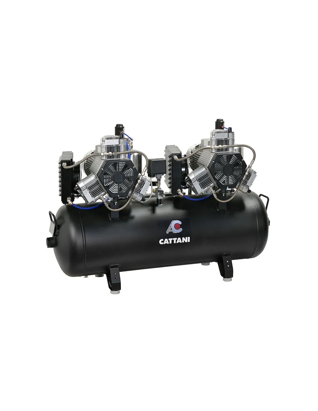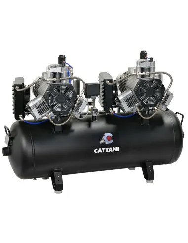 El modelo AC 610 de Cattani es un compresor de aire seco, libre de aceite, con depósito horizontal de 150 litros, ofrece un caudal efectivo a 8 bar. de 330 N litros por minuto.