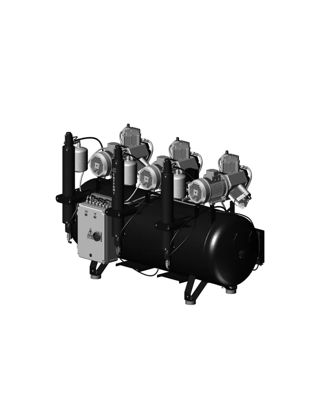 El modelo AC 910 de Cattani es un compresor de aire seco, libre de aceite, con 3 cabezas de 3 cilíndros con depósito horizontal de 300 litros, ofrece un caudal efectivo a 10bar. de 714 litros por minuto.