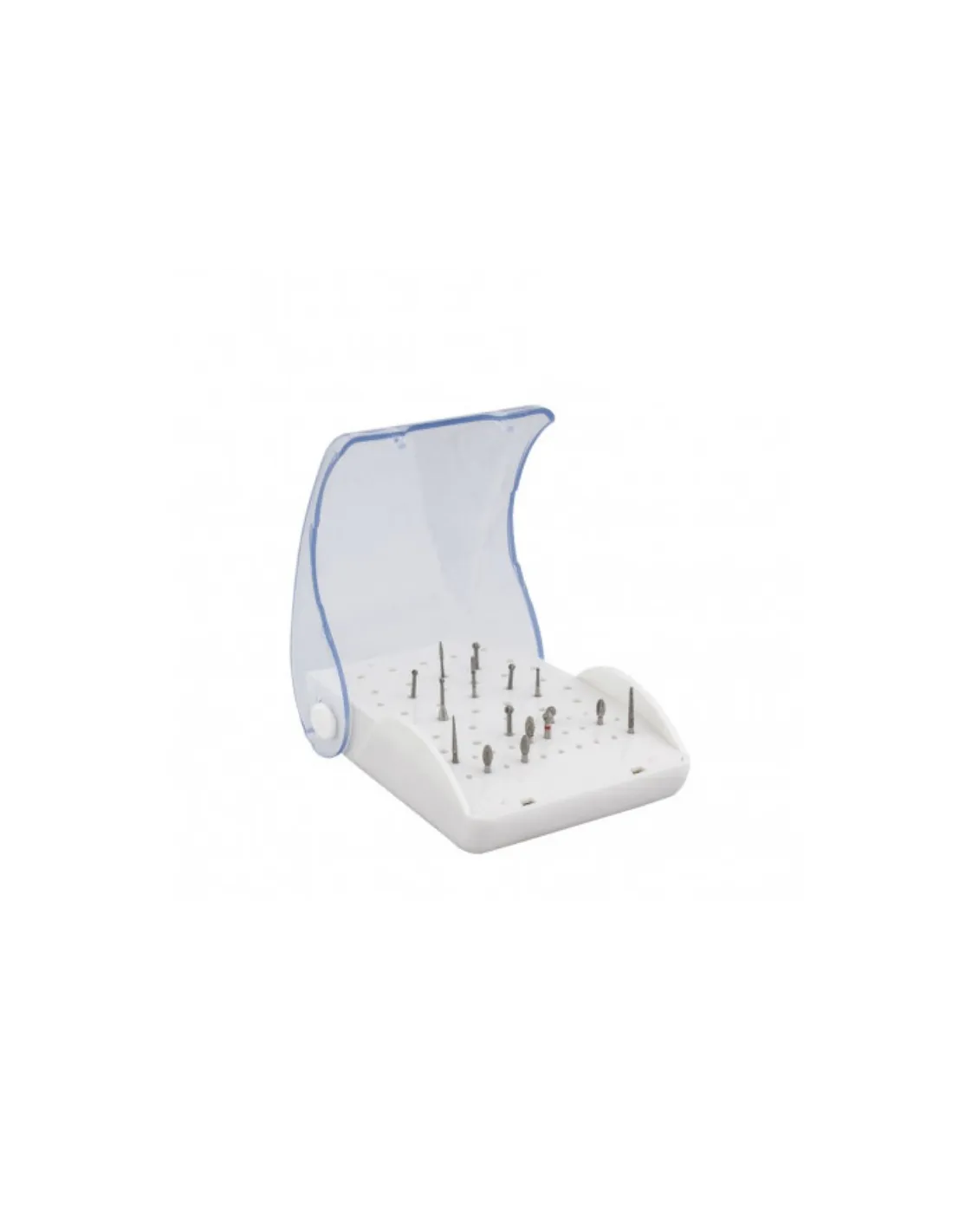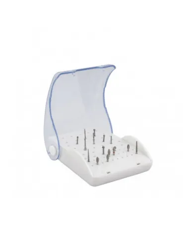 El fresero de 60 hoyos Bader está diseñado para guardar tanto fresas de turbina como para fresas de contraángulo.