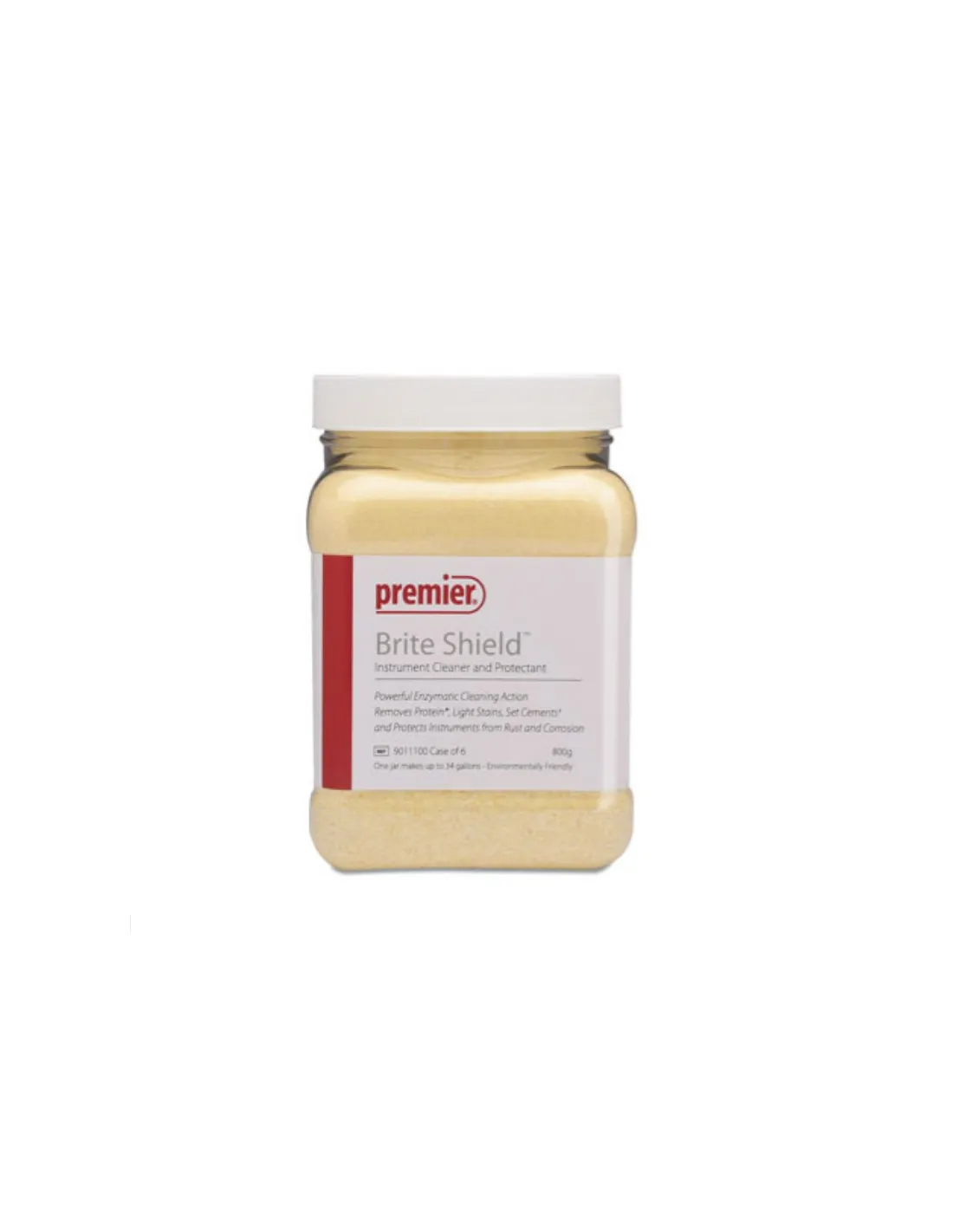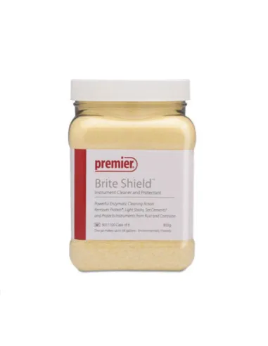 Brite Shield de Premier es un limpiador ultrasónico que limpia, pule y protege los instrumentos. Protege del óxido y de la corrosión mientras consigue una superficie lustrosa en los instrumentos de acero inoxidable.