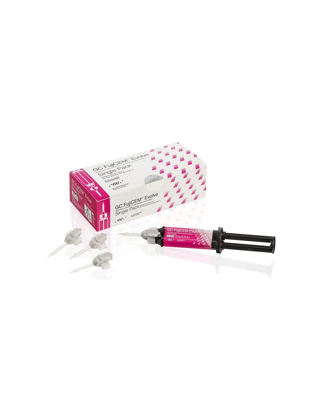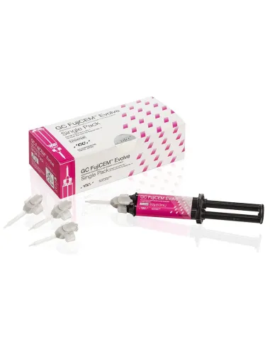 El envase del cemento de fijación FujiCEM Evolve Kit inicial de GC contiene 1 jeringas de 9,2g (5,0ml) y 15 Puntas de mezcla Push and Click Tip Regular.