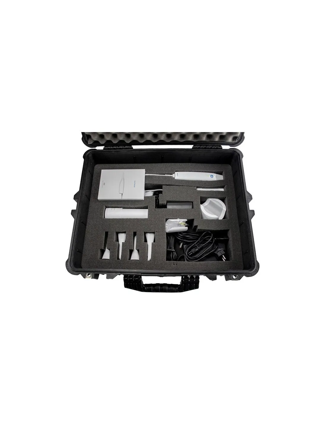 El maletín de transporte para el scanner intraoral Medit I500 es un práctico y cómodo accesorio que nos permite trasladar nuestro dispositivo sin miedo a dañarlo. Sus componentes permanecen en su lugar gracias a sus compartimentos.