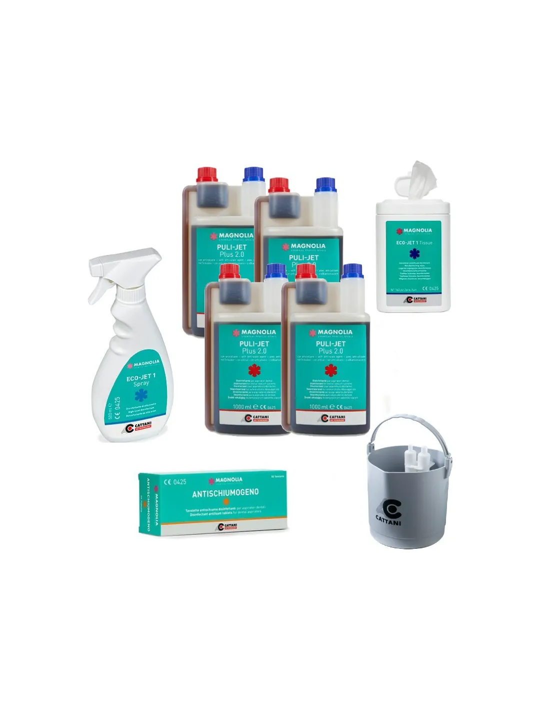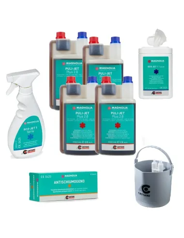 El kit Magnolia de Cattani contiene: 4 botellas de Puli-Jet Plus 2.0, 1 Eco-jet Spray, 1 Eco-Jet Toallitas, 1 antiespumogenos y un cubo Pulse Cleaner.