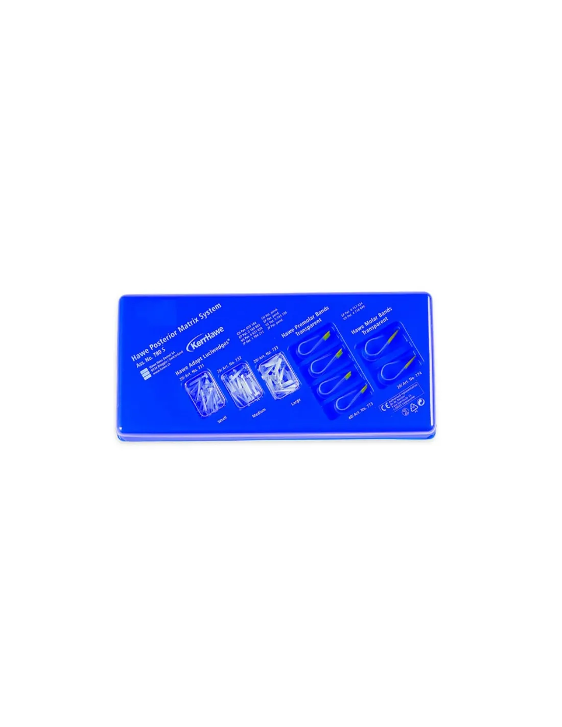La caja del kit de Matrices Hawe Transparentes contienen: 40 matrices para premolares, 20 matrices para molares, 15 Adapt Luciwedges. 20 cuñas.