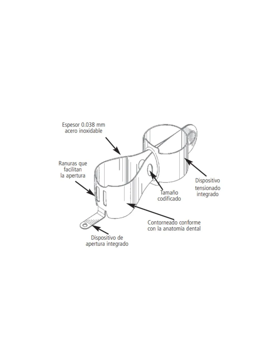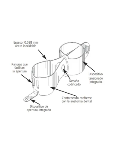 La banda matriz de 0,038 mm permite una colocación estable y sin distorsión por medio de puntos de contactos ajustados. Todo ello, gracias a su forma contorneada que facilita un perfecto control. Además, no presenta protuberancias y no precisa de mucho acabado.