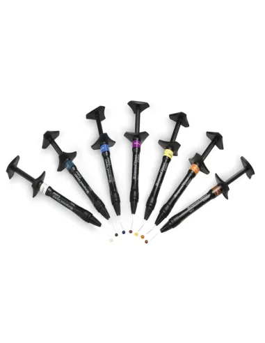 Sus colores han sido seleccionados para realizar caracterizaciones de aspecto natural, tanto en restauraciones directas con composite, como en restauraciones indirectas CAD/CAM y para enmascarar estructuras dentales decoloradas.