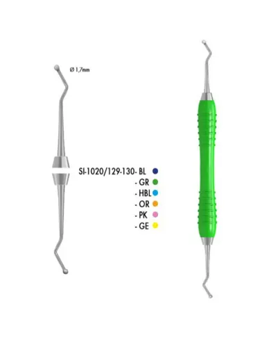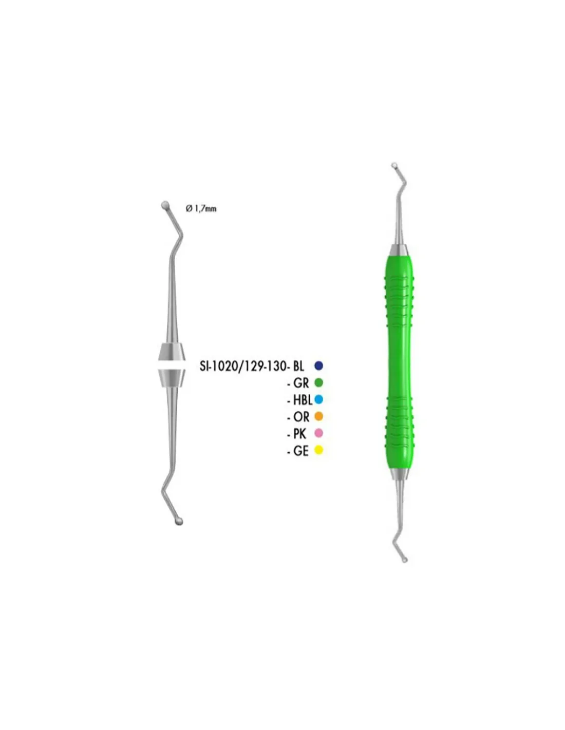 El instrumento dental SI-1020/129-130.. es un excavador fino, cuya doble parte activa tiene forma acodada de diámetro 1,7 mm y es cortante. Indicado para retirar manualmente el tejido careado.