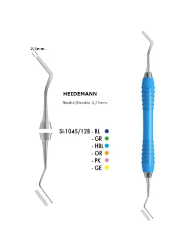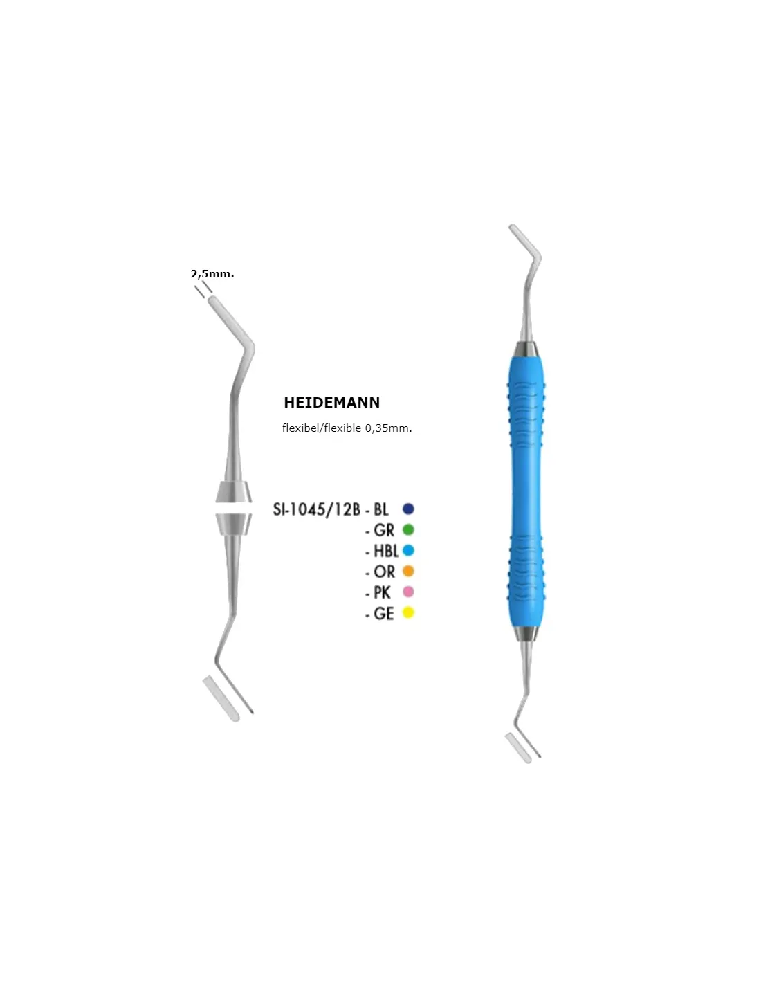 El instrumento dental SI-1045/12B es una espátula doble Heidemann de partes activas planas y de tamaño 2.5mm, flexibel 0,35mm.