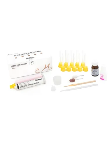 Sofreliner Tough M - medium es un material blando a base de silicona para rebase directo e indirecto. Indicada para la resolución de los problemas relacionados con una mucosa fina, con crestas cortantes y grandes áreas socavadas