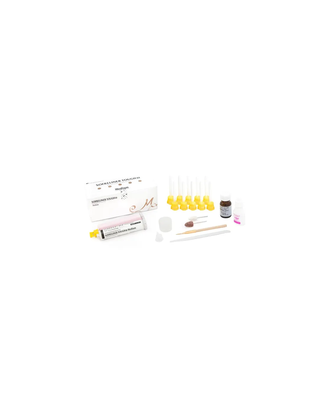 Sofreliner Tough S - Soft es un material extra blando, especialmente indicado como acondicionador de los tejidos para las prótesis a largo plazo, implantología y cirugía.