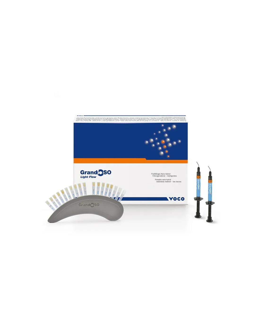El envase de GrandioSO Light Flow Set de VOCO contiene 5 jeringas de 2gr.