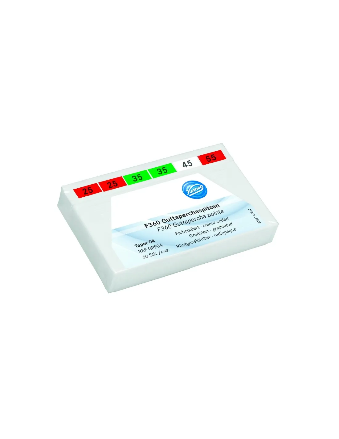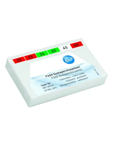 El envase de conos de guttapercha F360 Komet contiene 60 unidades, en surtido de tamaños.