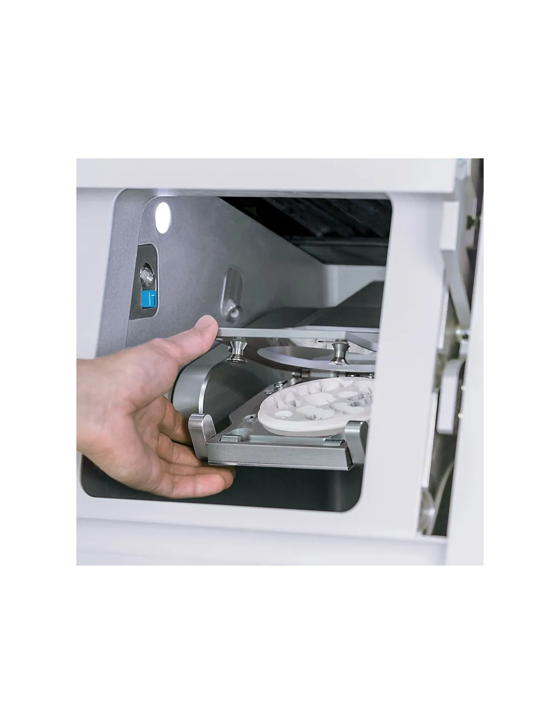 La fresadora en seco Easy 5+ cuenta con un cómodo cajón para accesorios para el correcto almacenaje de herramientas, etc. Incluye un tablero de herramientas administrado integrado (ATB) para herramientas de fresado y 30 ranuras numeradas administradas por el software DentalCAM.