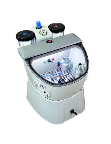 Cuenta con dos depósitos, dos pistolas móviles para microchorreado y una pistola estática de Ø3 mm. Gran depósito de arena.