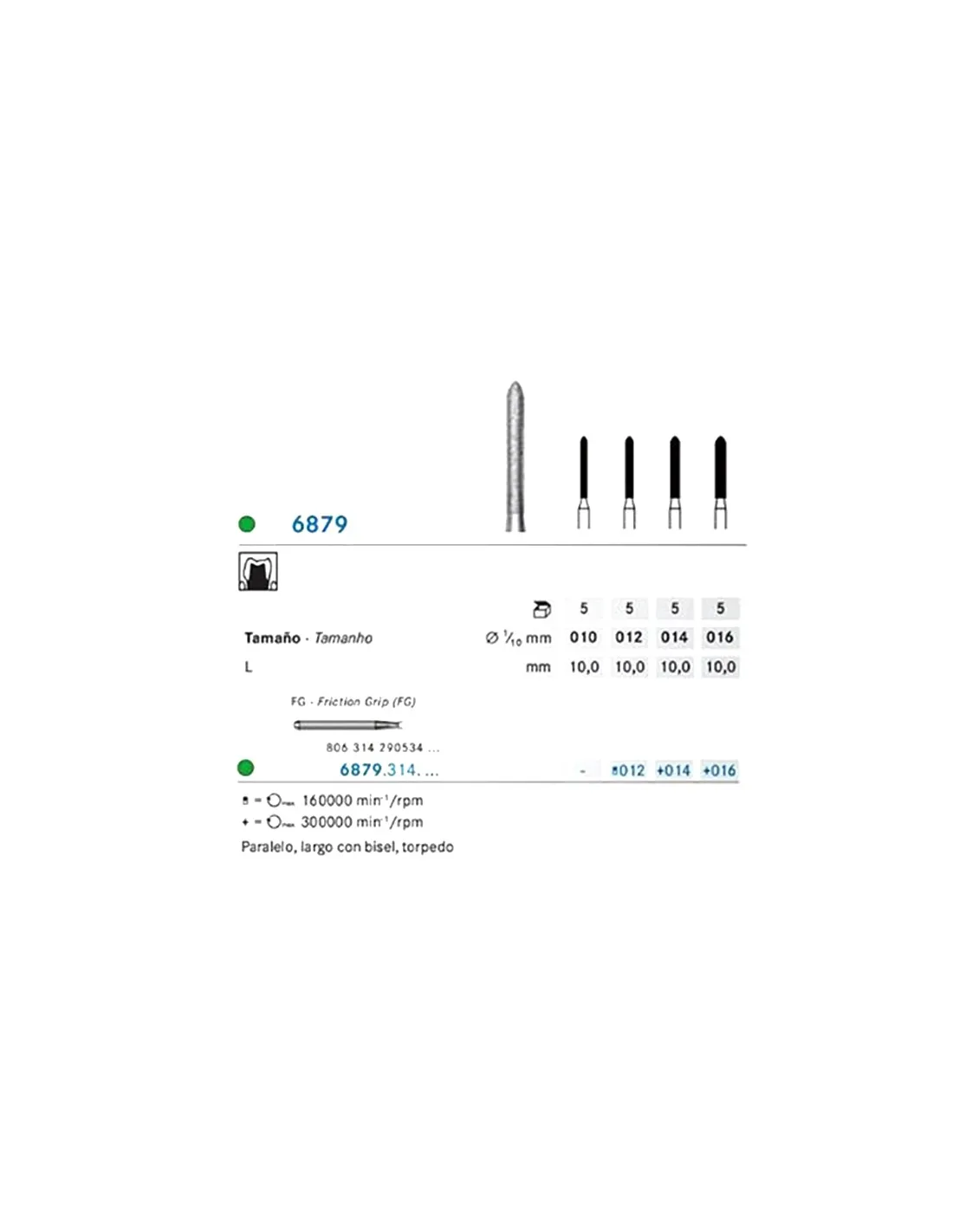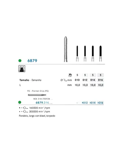 La fresa 6879 de Komet es una fresa diamantada FG para turbina, con forma de lanza. El tamaño del grano es grueso (color verde). Existen 3 diámetros de cono diferentes.