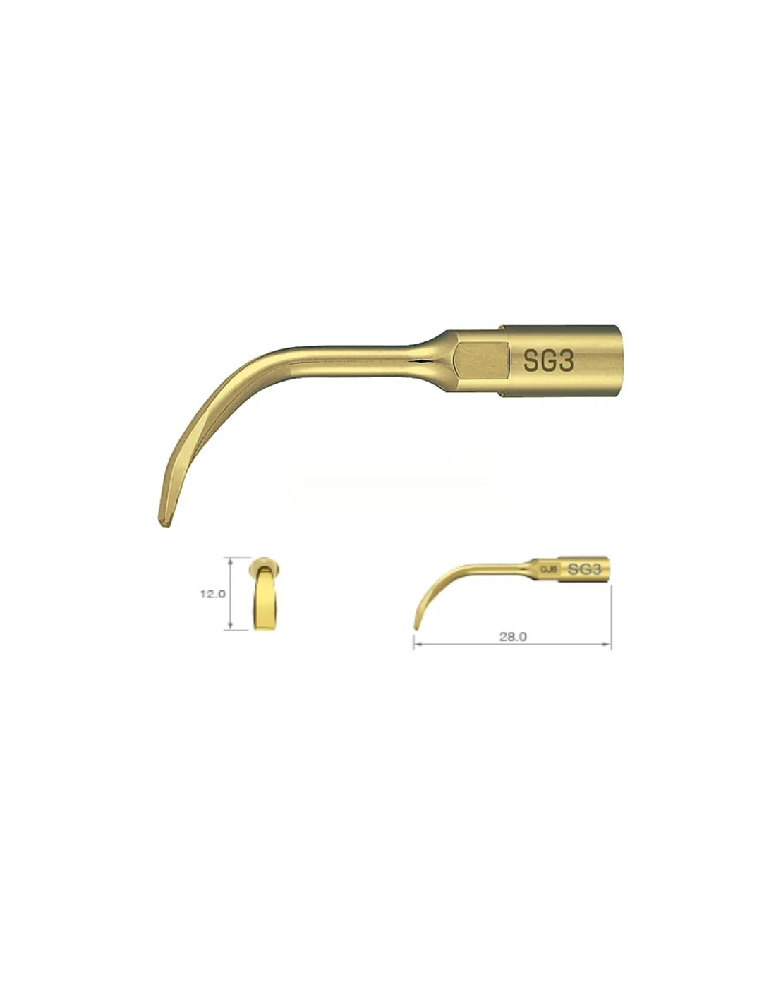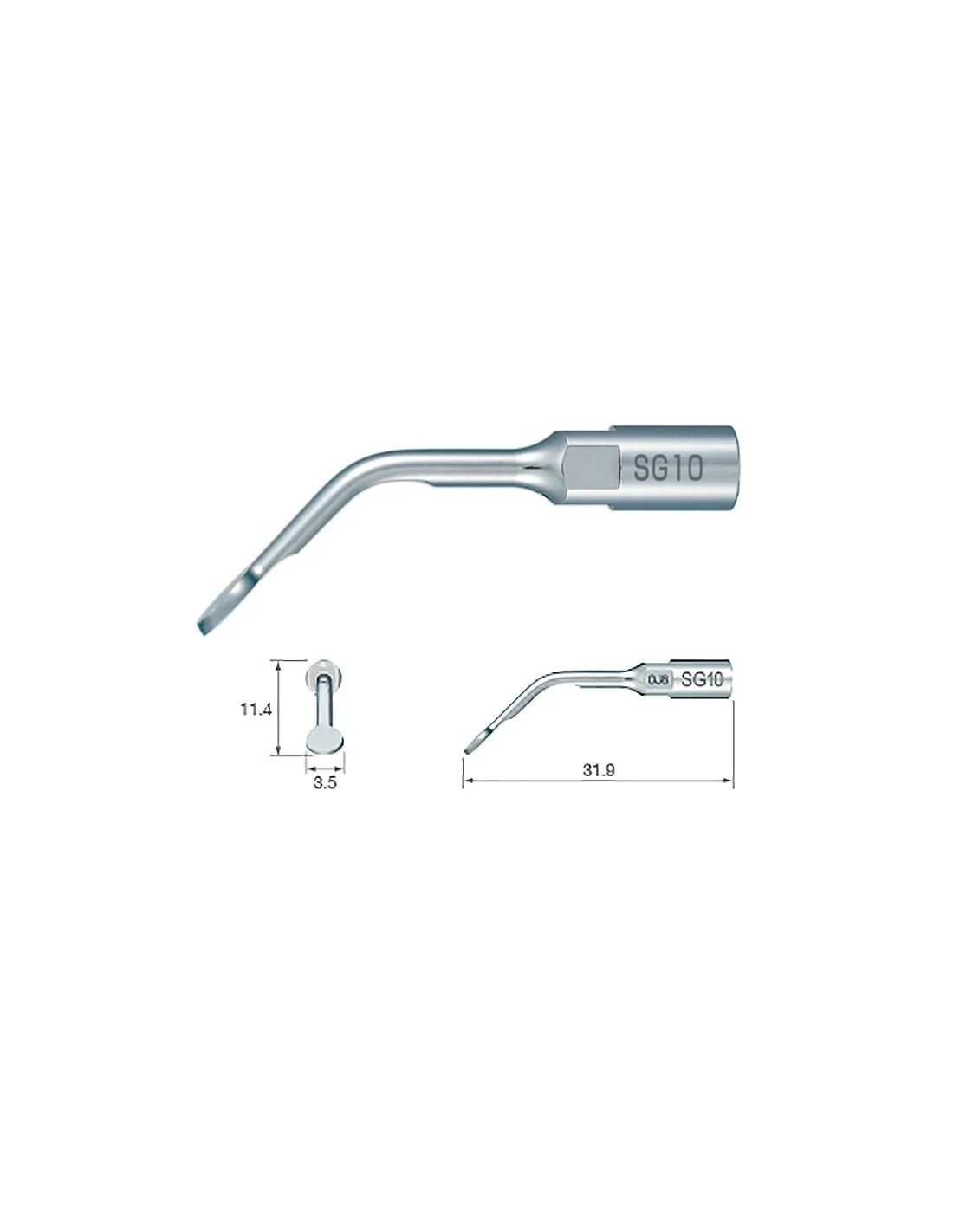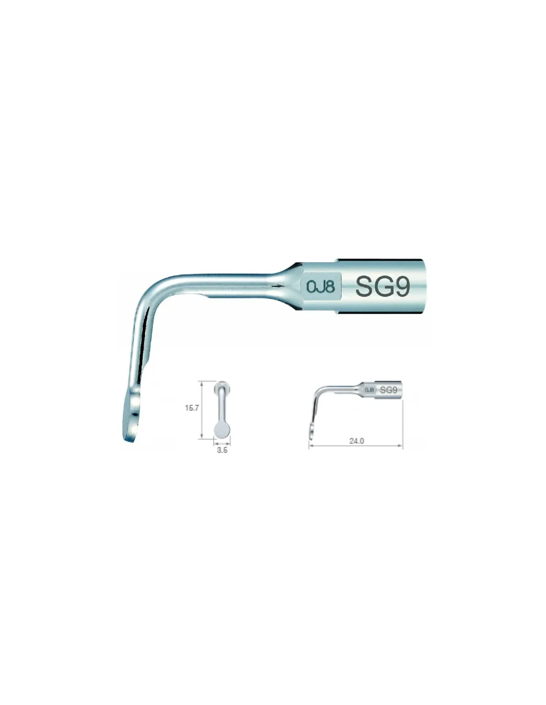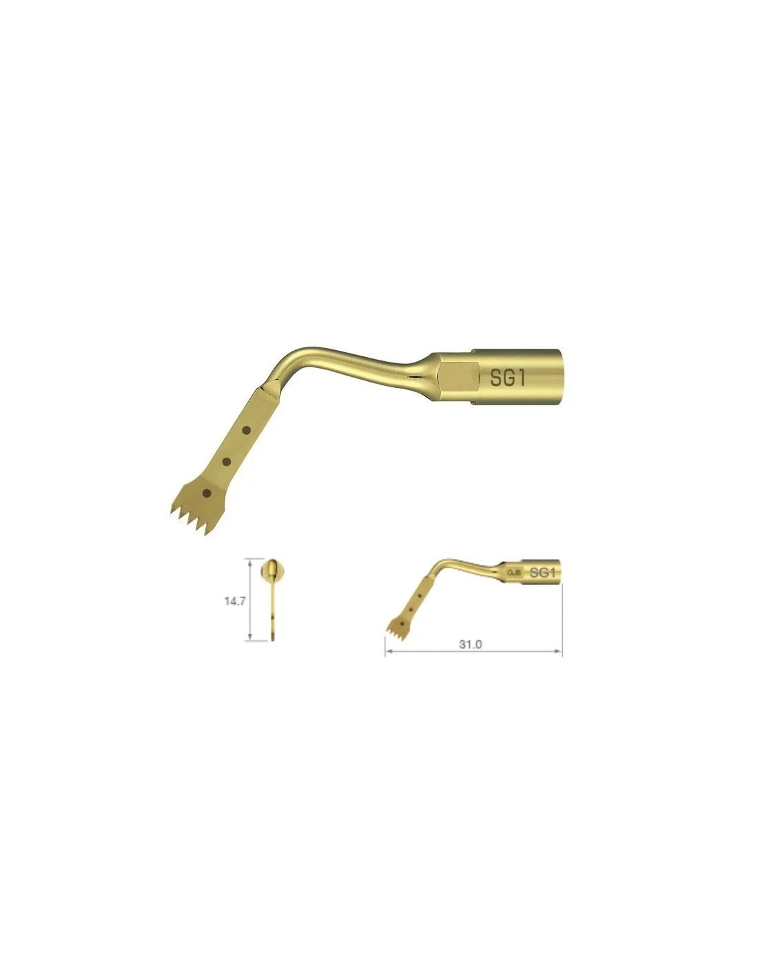 - SG1 - es una punta para cirugía ósea con marcas en los 3, 6 y 9mm desde la parte superior de la punta. Con cinco dientes: 0,6mm de grosor.