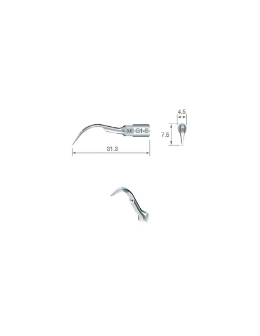 El kit incluye la punta escarificadora G1-S, indicada para la eliminación del sarro. Y 4 puntas de endodoncia retrógrada: