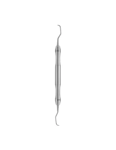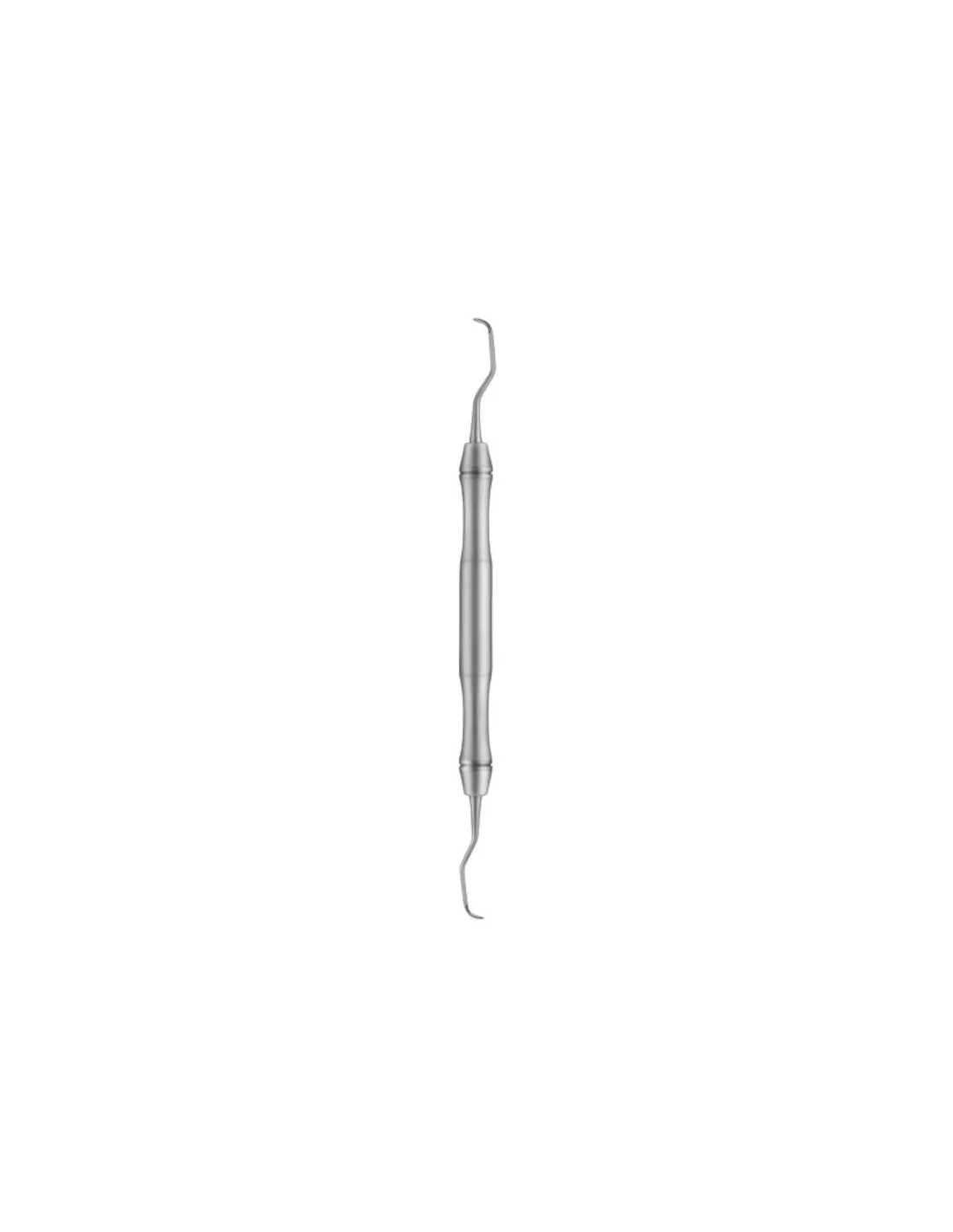 Es una cureta poco angulada con mango ligero y ergonómico.