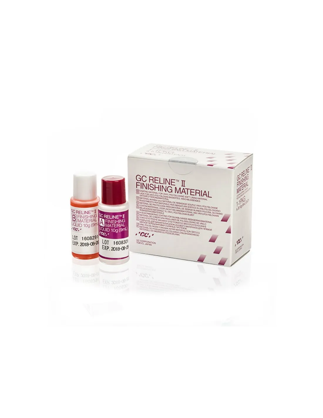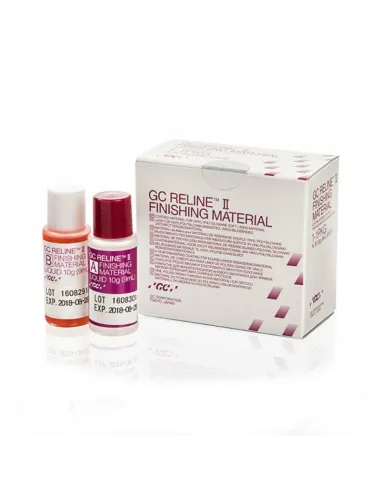 El envase de Reline II Finishing Material de GC contiene 1 x Bote A 9ml 10g , 1 x Bote B 9ml 10g , 1 x block de mezclas y esponjas.