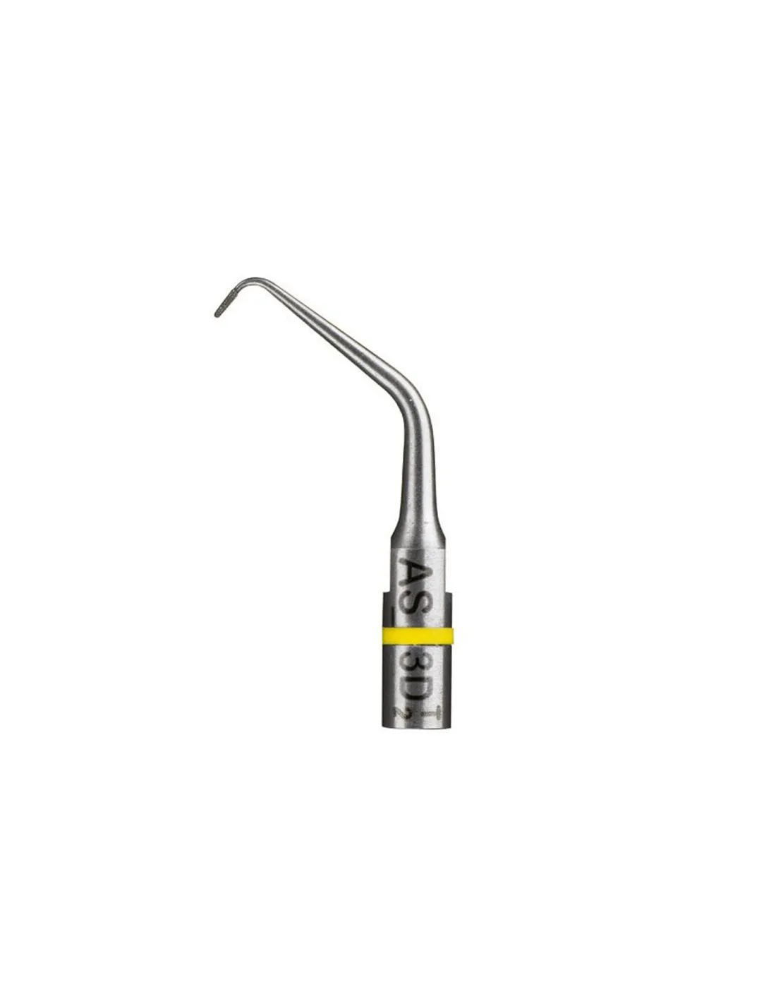 - AS3D, primer instrumento de la secuencia Endosuccess, es un inserto universal diamantado 30 μm, conicidad del 9% y longitud de trabajo de 3mm. El inserto AS3D está indicado para cirugía apical de los dientes anteriores. Debe utilizarse sin presión, a la potencia efectiva más baja posible.