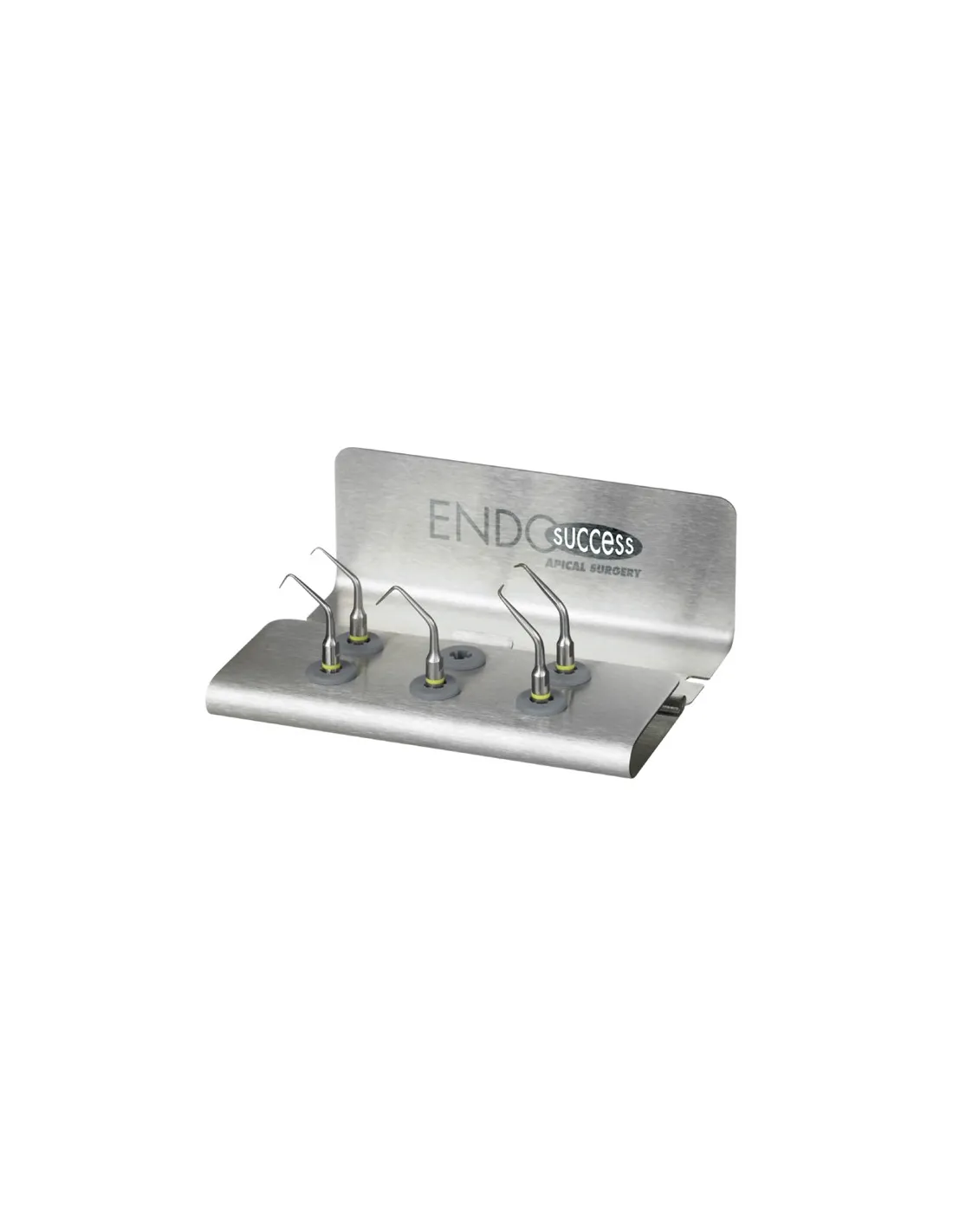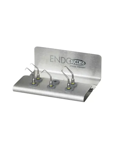 El kit Endosuccess Apical Surgery de Satelec contiene insertos: AS3D, AS6D, AS9D, ASRD y ASLD, 1 caja soporte inox y 1 llave esterilizable.