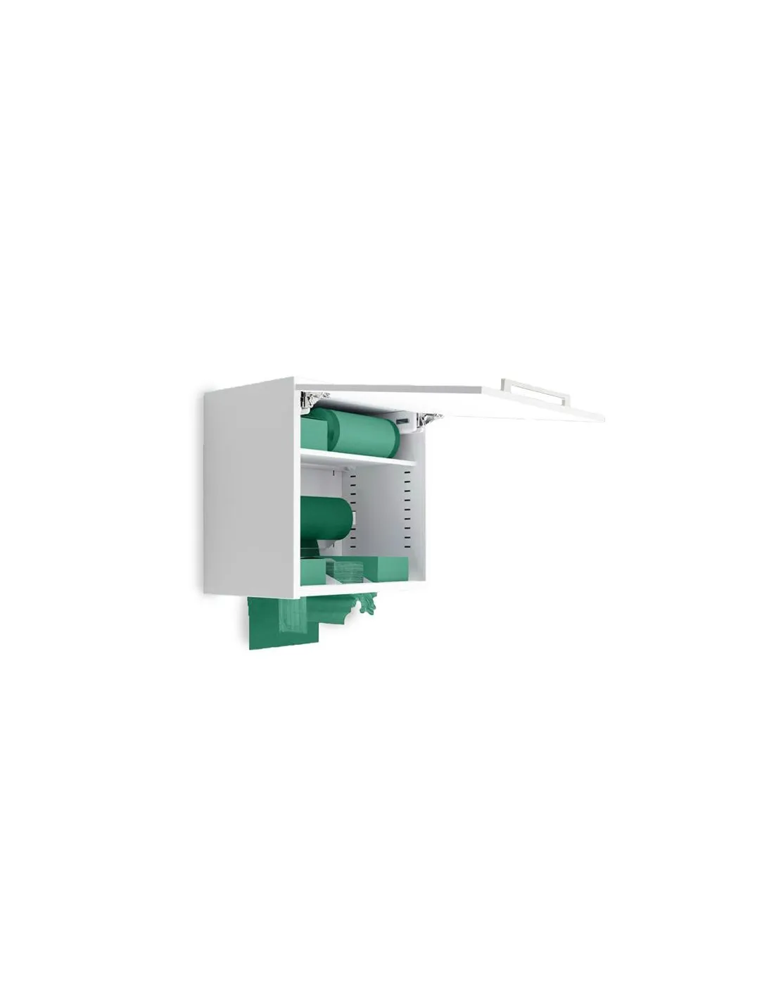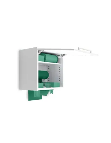 Este mueble de pared, dispensador, es de apertura vertical, lo que facilita para el colgar contenedores y dispensadores de productos desechables como baberos, rollos de papel, servilletas o guantes y mantenerlos higiénicamente a salvo hasta su uso.