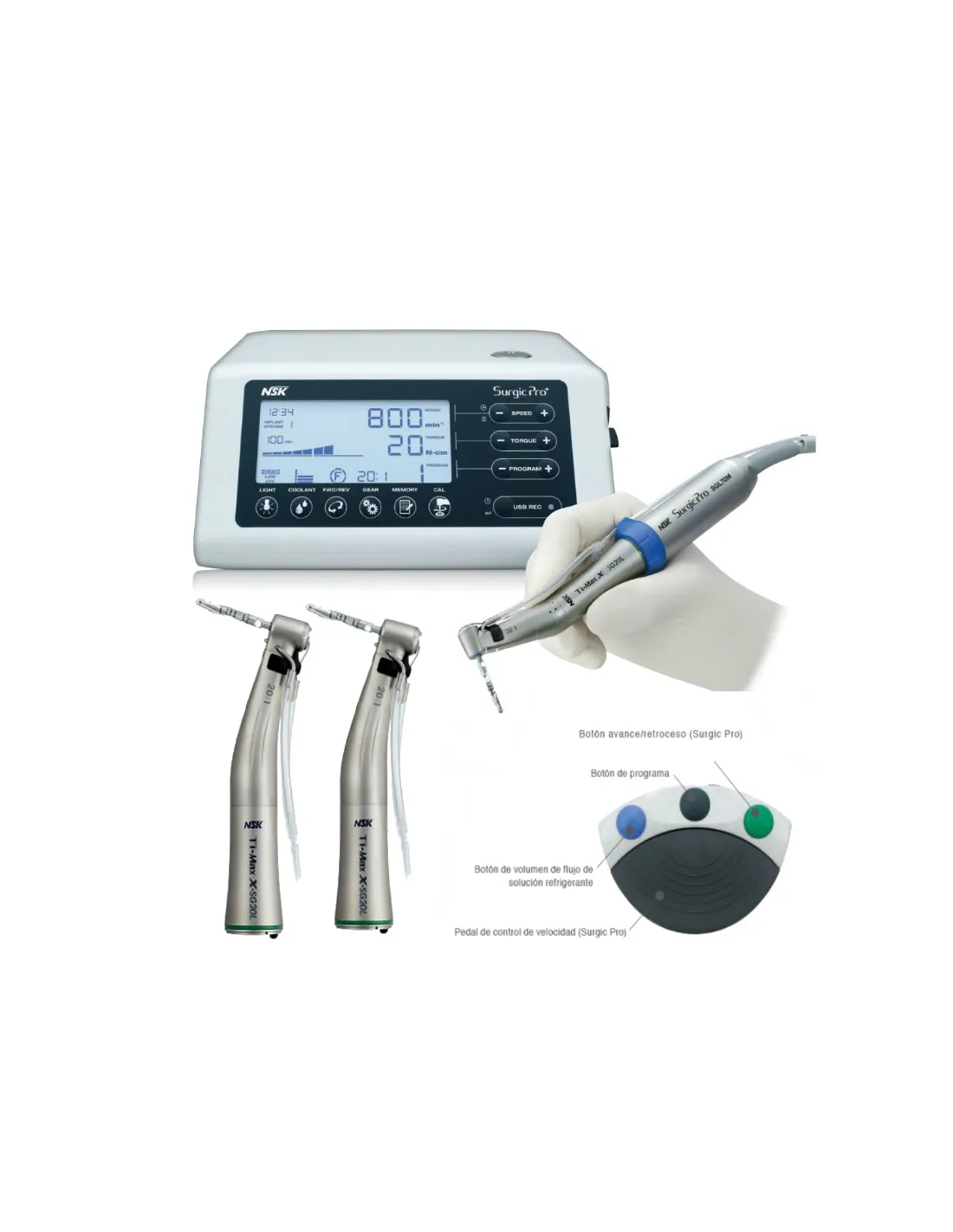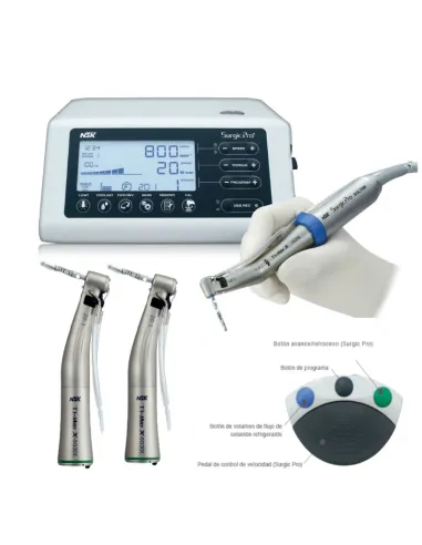 Surgic Pro LED de NSK, es un micromotor para cirugía oral e implantes, sin almacenamiento de datos. Su unidad de control posee una amplia pantalla LCD y botones de manejo intuitivo. El pedal de control permite el manejo de múltiples funciones sin necesidad de tocar el panel de control.