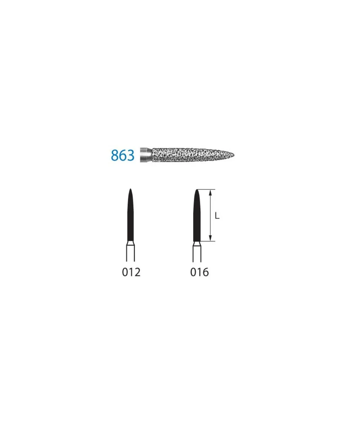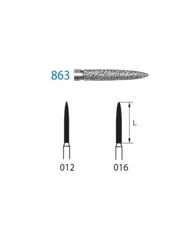 Fresa dental 863 de Komet es una fresa diamantada con forma de llama larga, indicada para la preparación de coronas y la remoción de obturaciones.