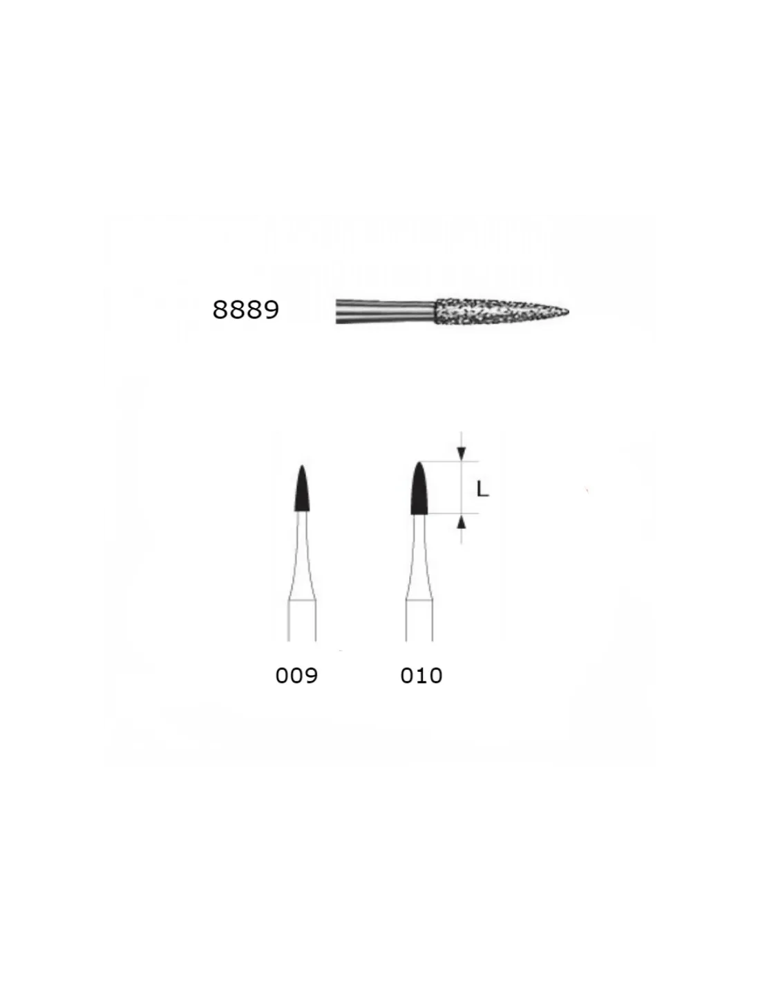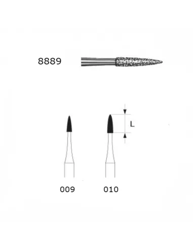 Fresa dental 8889 de Komet es una fresa diamantada, aguja, de grano fino (46µm), anillo rojo, indicada para la preparación de coronas.