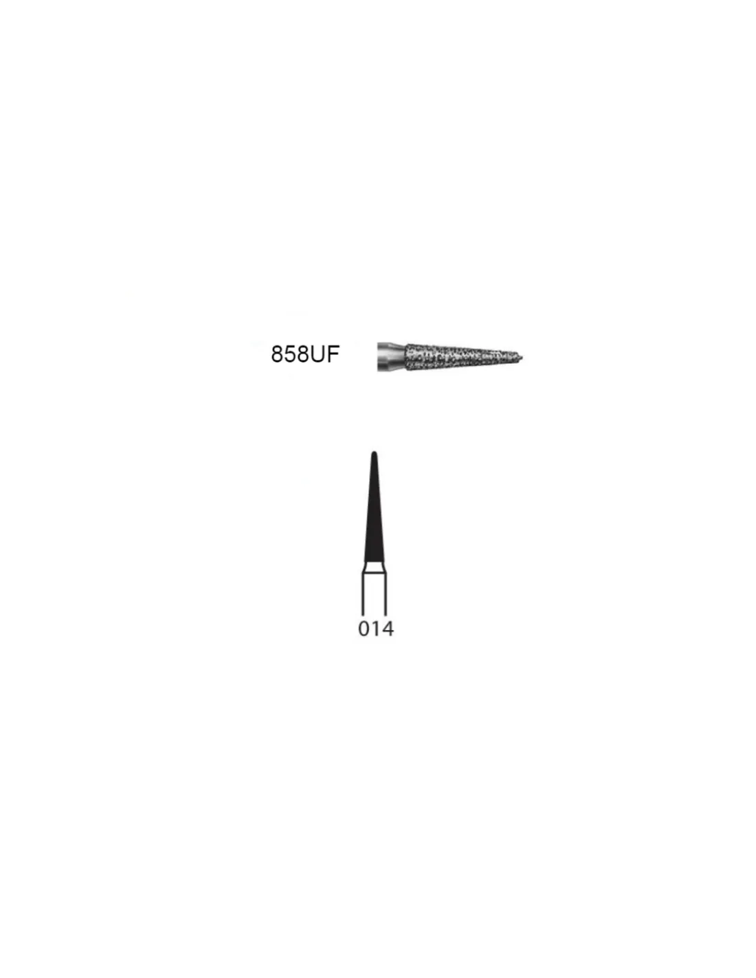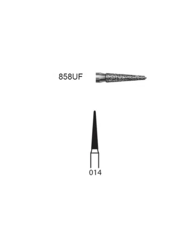 La fresa dental Komet 858UF es una fresa diamante para clínica turbina con forma de lanza puntiaguada.