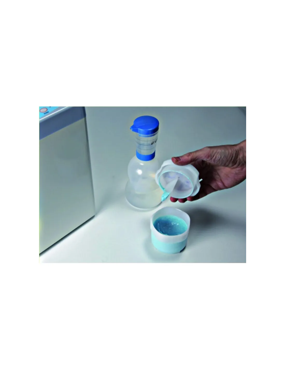 La máquina mezcladora centrífuga automática Mestra se suministra con cuatro tazas, un práctico dosificador de agua, un agitador, una espátula y un soporte.