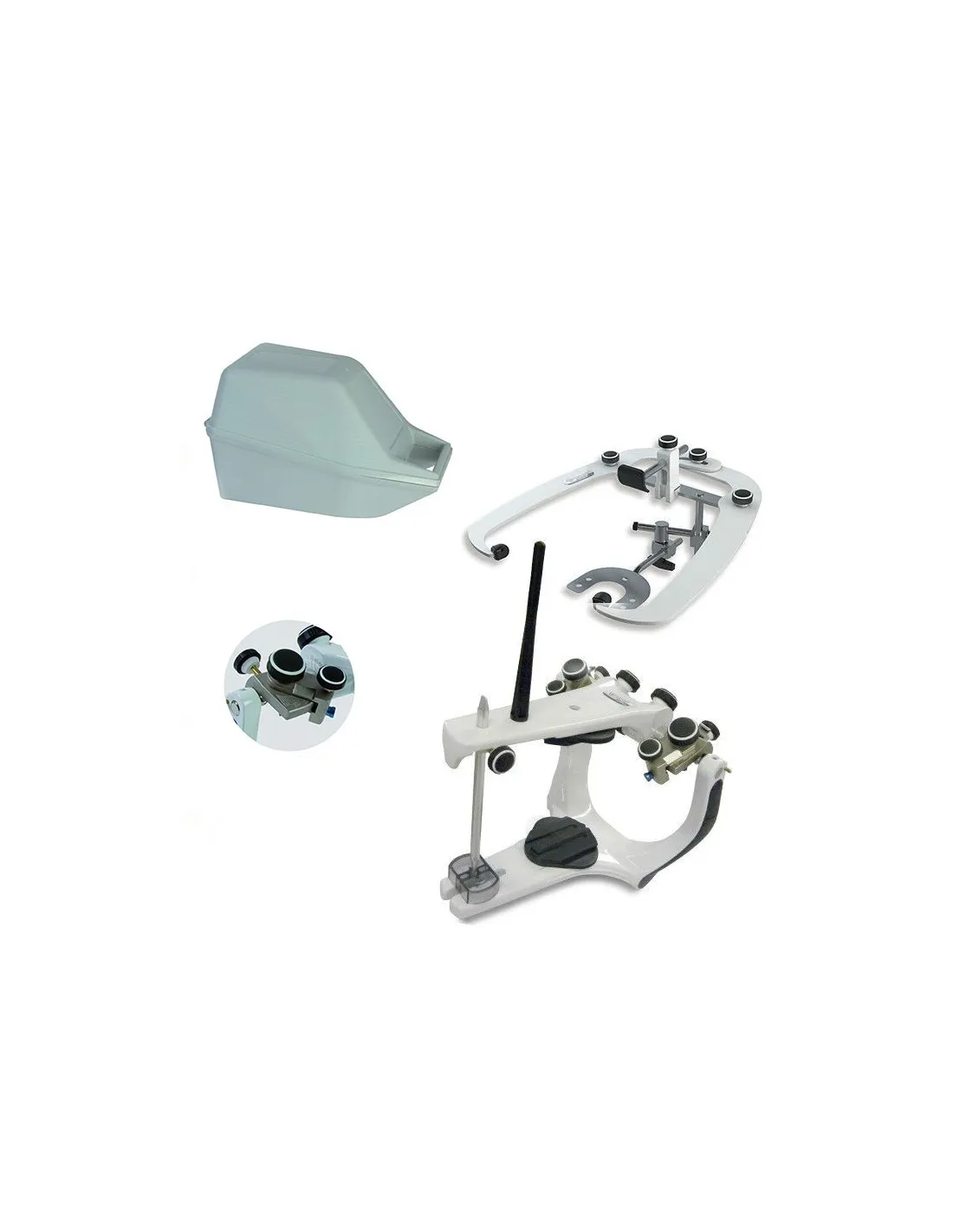 Kit ahorro de sistema de articulación maxilo-facial, compuesto por articulador Arquímedes Protrusal, arco facial estándar y estuche de transporte fabricado por Bio-Art para Mestra.