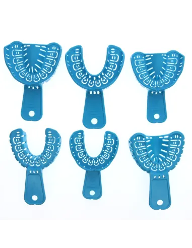 El kit de cubetas para implantes y prótesis consta de 6 unidades en tamaños L, M y S, para arcada superior e inferior, 1 cubeta de cada tipo.
