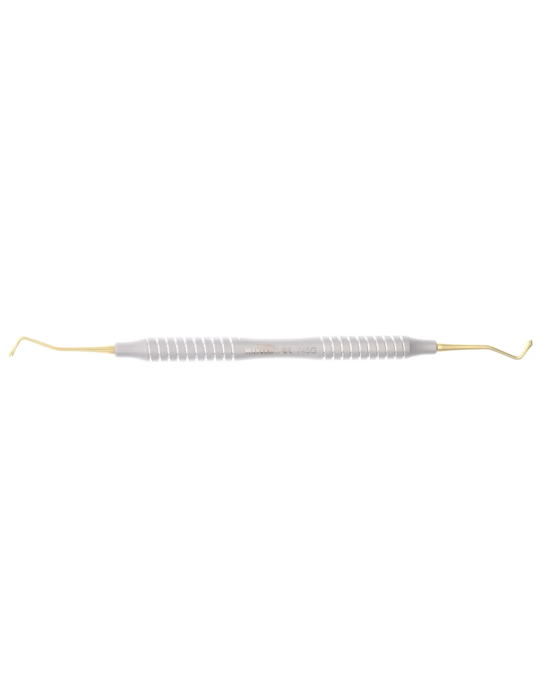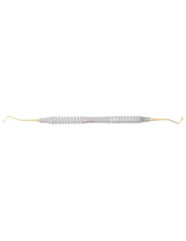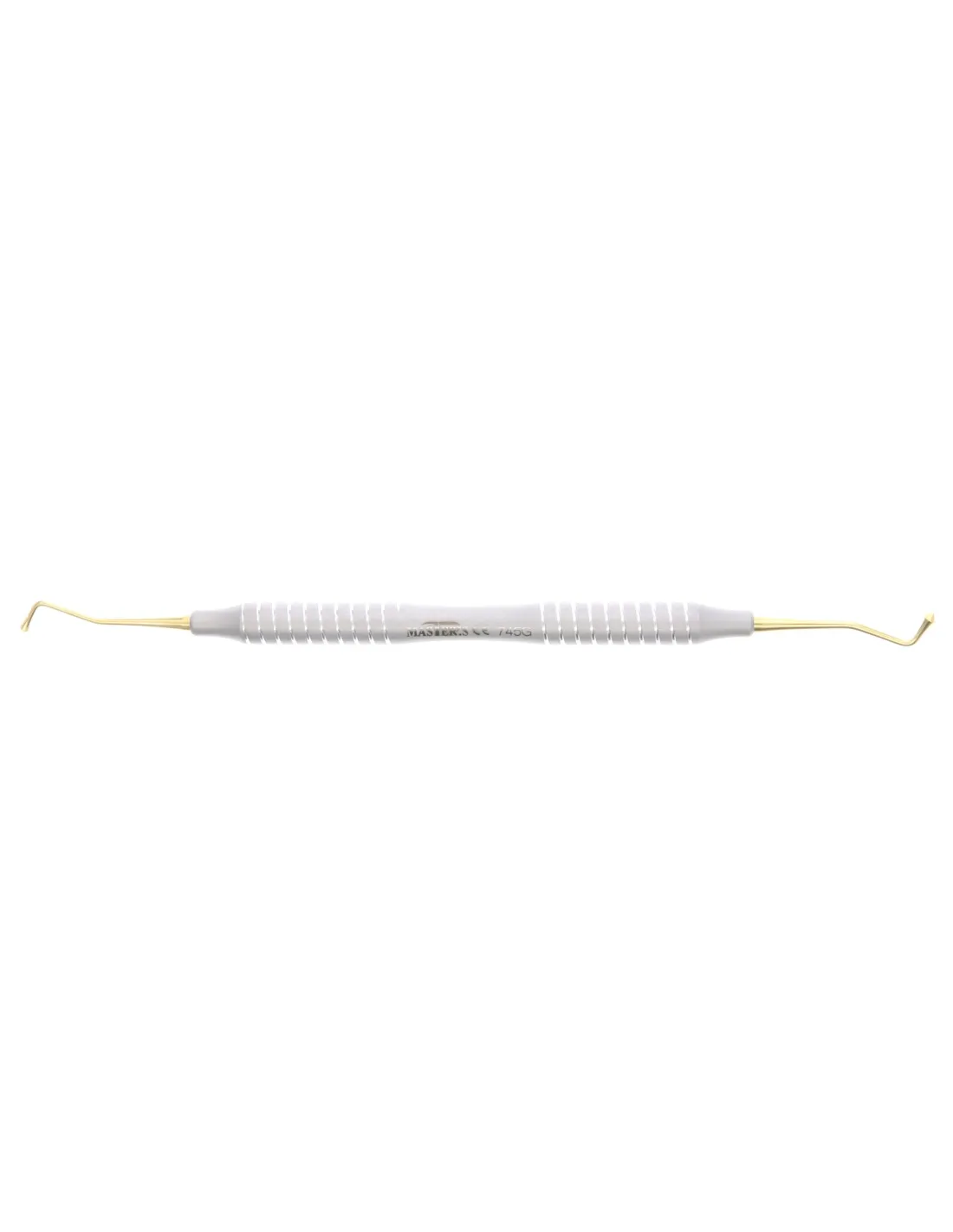 Pertenece a la línea de instrumental dental Gold Line Titanium Coated de Masters, fabricados en acero inoxidable alemán de alta calidad y recubiertos por titanio, que aporta una mayor duración.