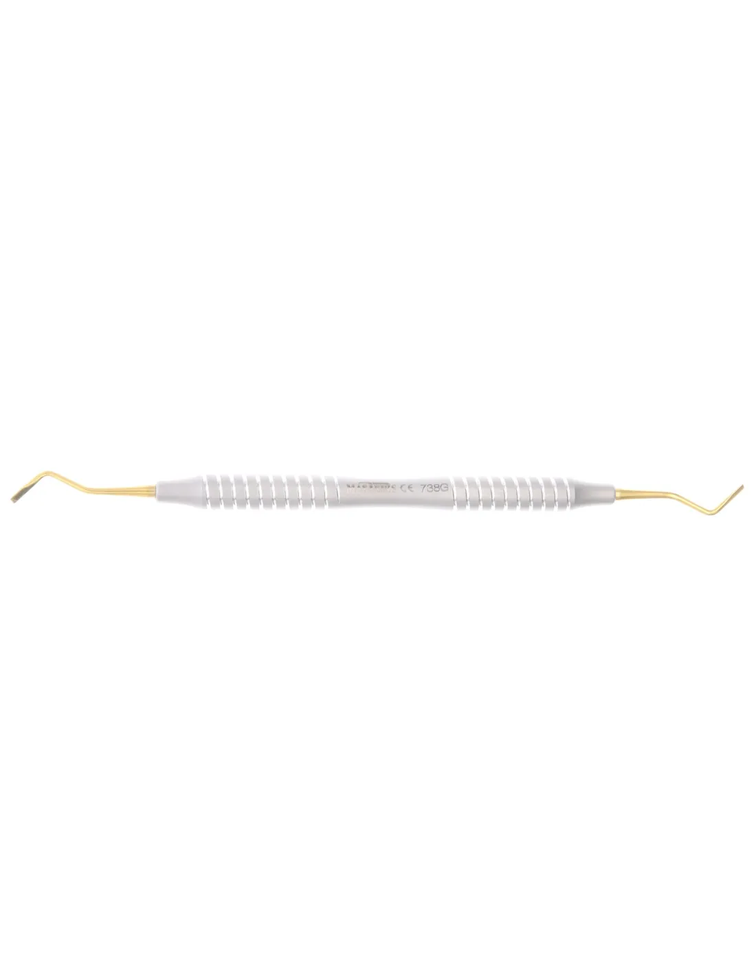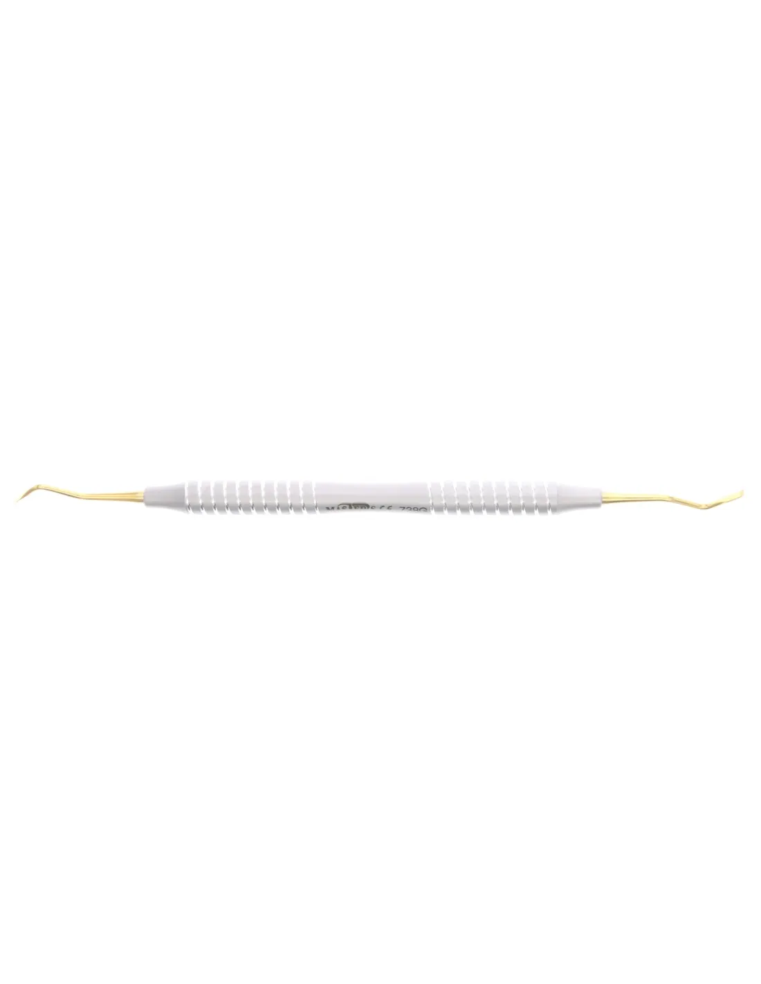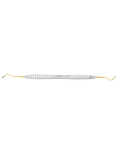 Pertenece a la línea de instrumental dental Gold Line Titanium Coated de Masters, fabricados en acero inoxidable alemán de alta calidad y recubiertos por titanio, que aporta una mayor duración.