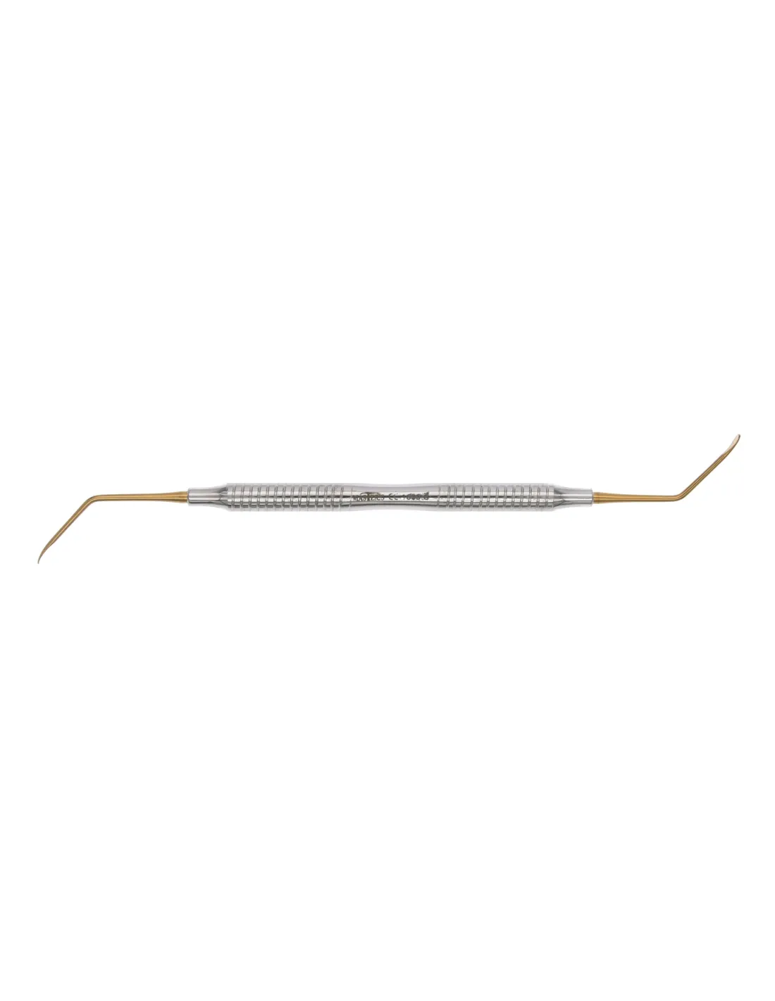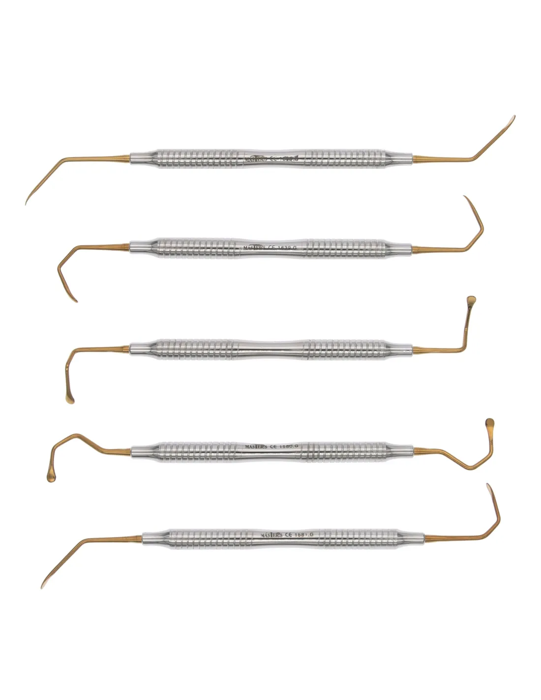 Pertenecen a la línea de instrumental dental Gold Line Titanium Coated de Masters, fabricados en acero inoxidable alemán de alta calidad y recubiertos por titanio, que aporta una mayor duración.