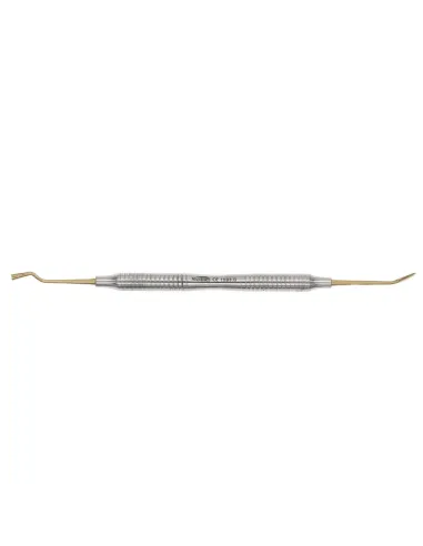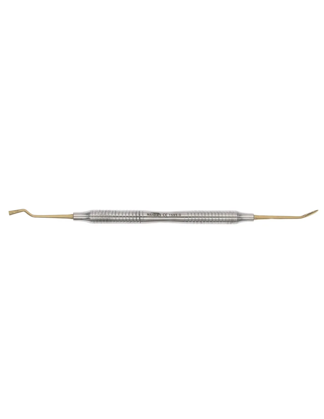 Pertenece a la línea de instrumental dental Gold Line Titanium Coated de Masters, fabricados en acero inoxidable alemán de alta calidad y recubiertos por titanio, que aporta una mayor duración.
