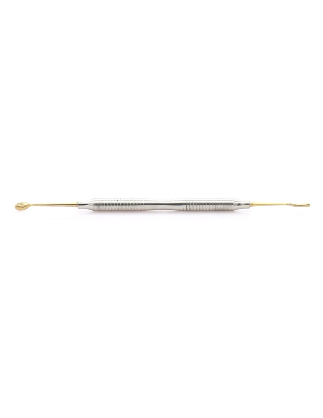 Este instrumento de implantología tiene doble parte activa, una con forma de cucharilla 5x10mm y un compactador de hueso 3mm.