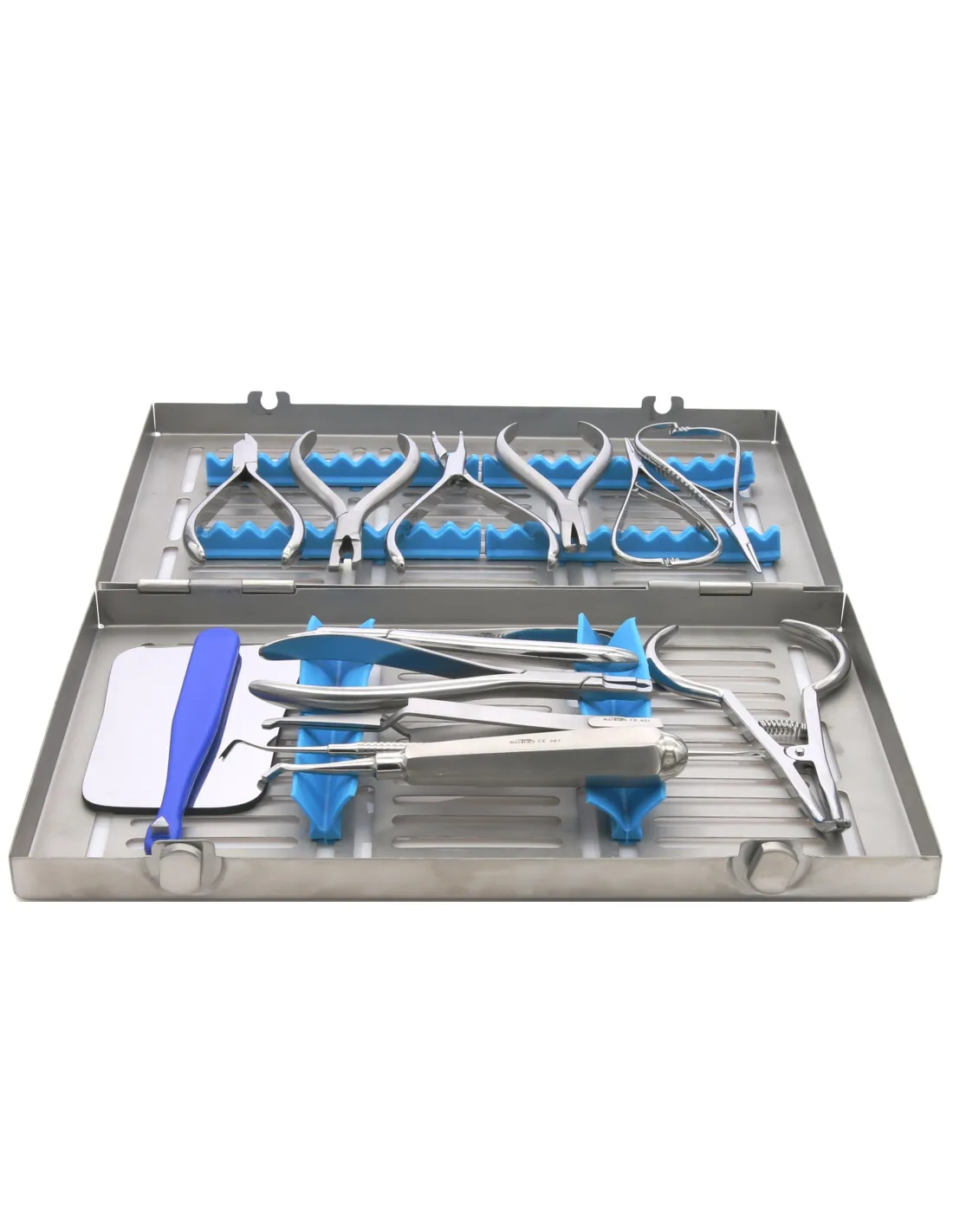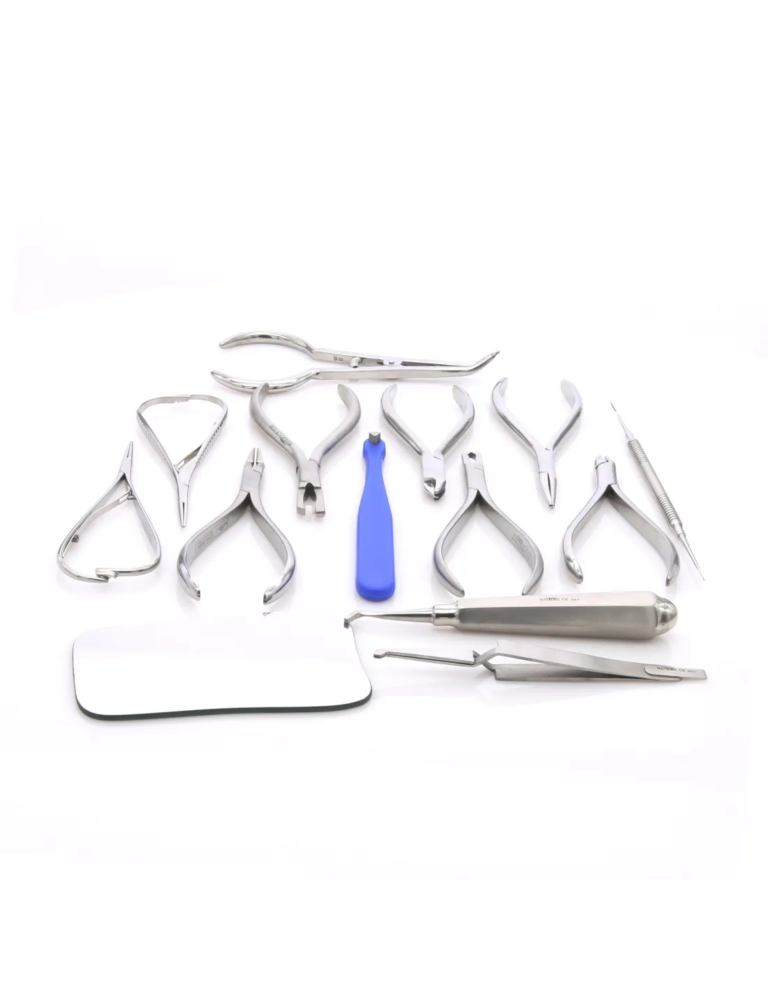 Set de Ortodoncia compuesto por 14 instrumentos imprescindibles para tratamientos de ortodoncia, junto con una caja de esterilización con capacidad de 20 instrumentos.