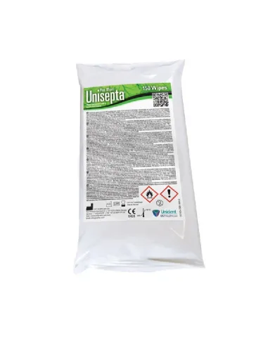 Unisepta Plus Wipes de Unident son unas toallitas impregnadas en un potente desinfectante a base de etanol, indicadas para limpiar, desinfectar y desodorizar rápidamente todo tipo de superficies de dispositivos médicos no invasivos.