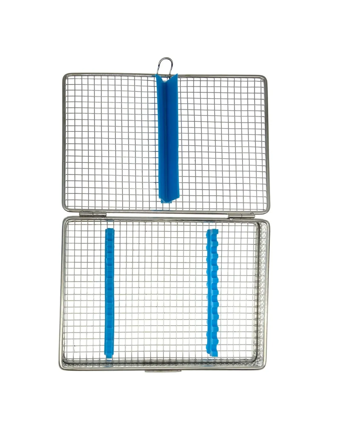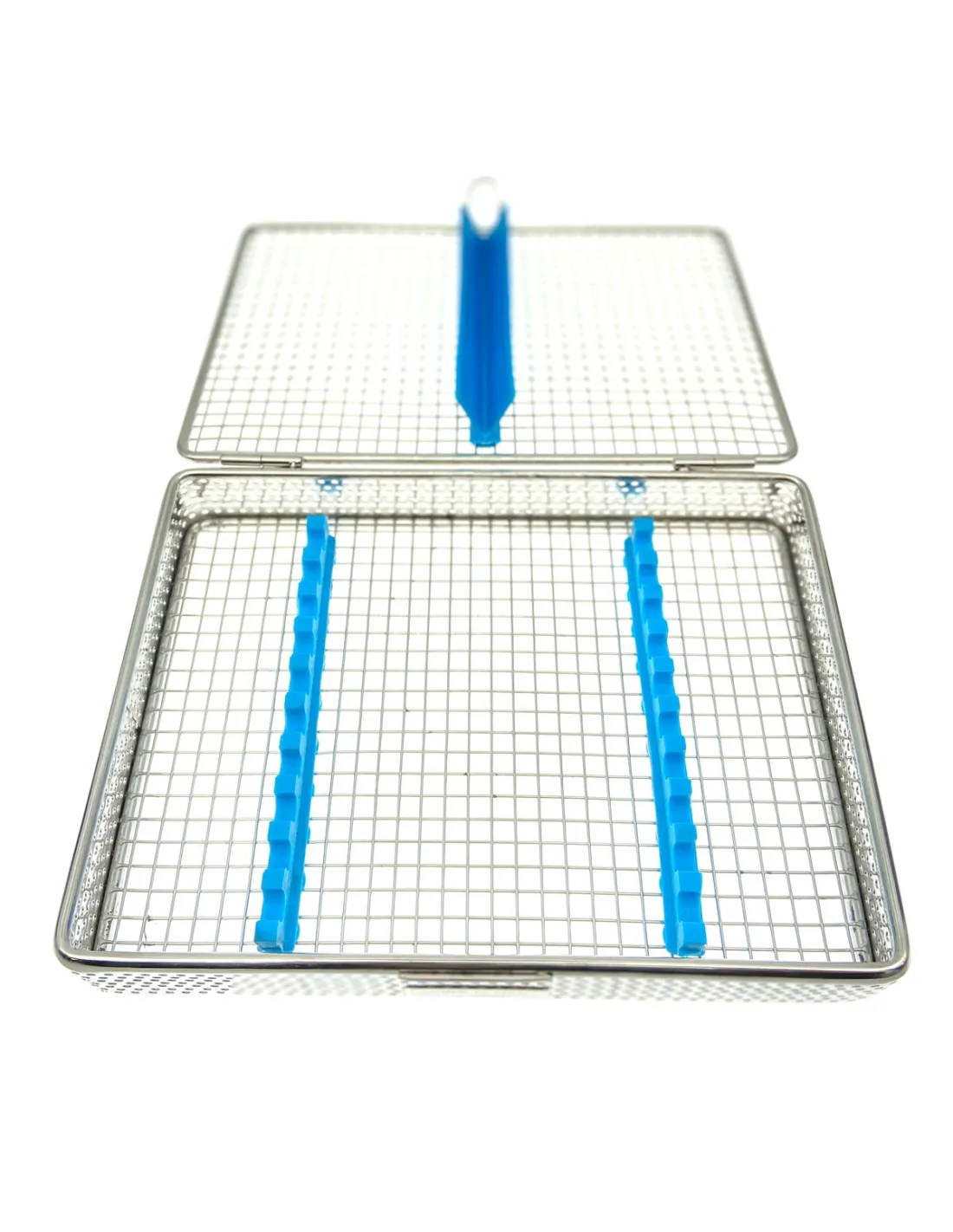 La bandeja para esterilizar con tapa de Masters está fabricada en acero inoxidable y cuenta con separadores de silicona en su interior para una correcta sujeción de los instrumentos dentales.