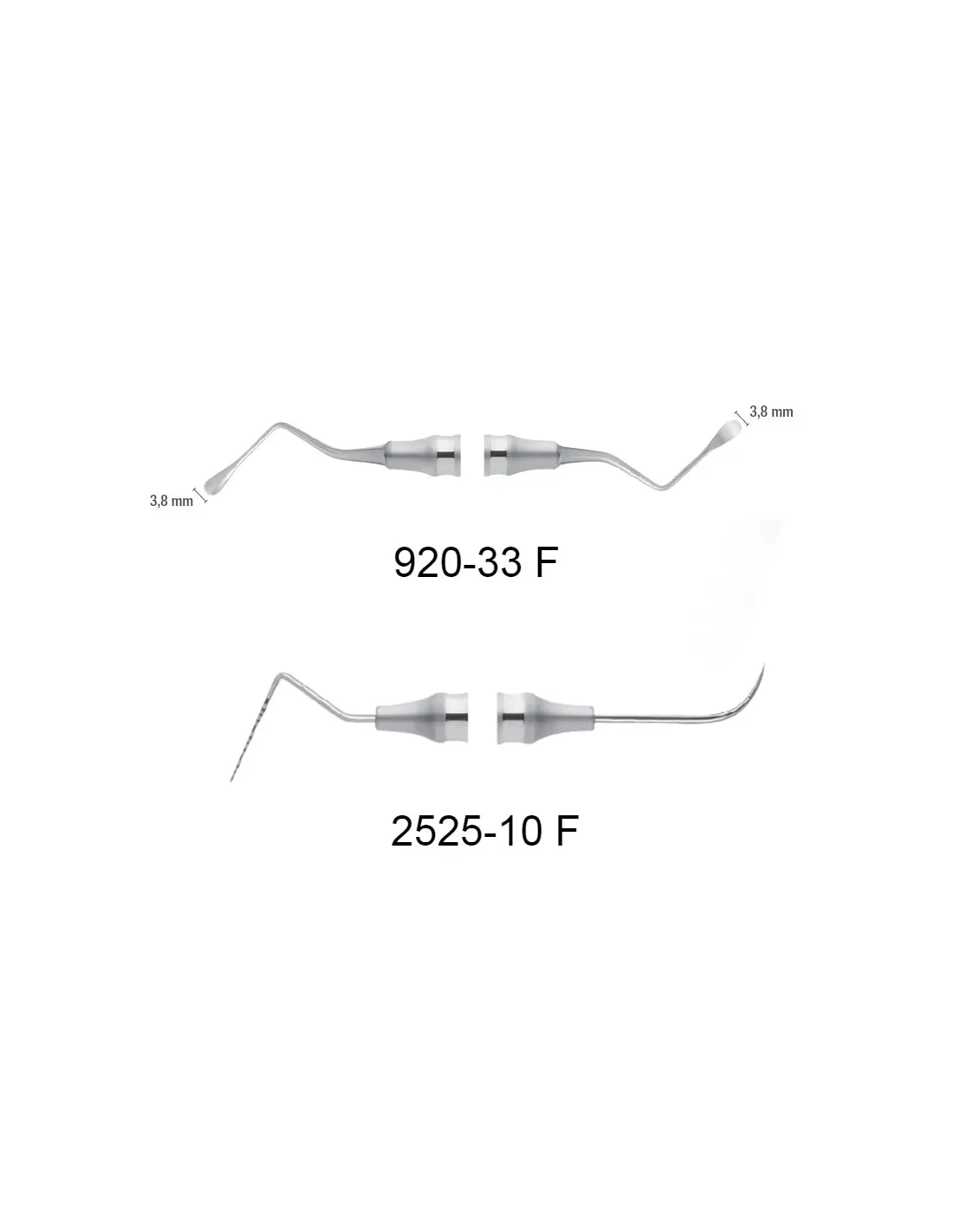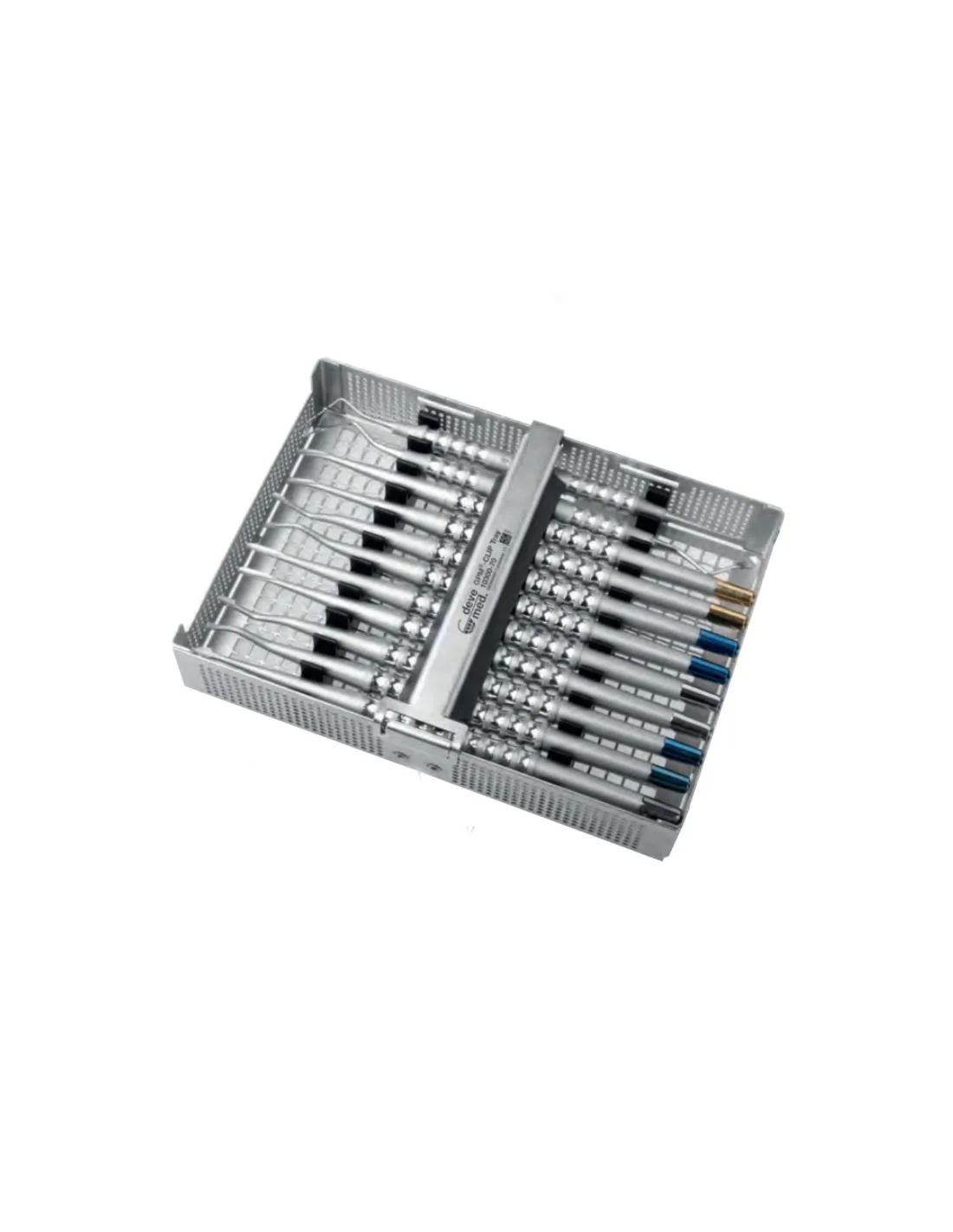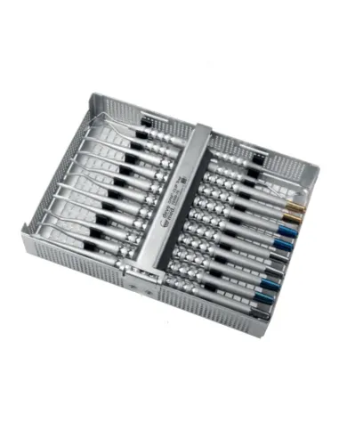 Este set contiene instrumentos con mango RS, redondo y sólido, que ofrece una transmisión de la potencia mejorada y con mayor control y mango SL, ultraligeros. Ambos permitiendo un trabajo táctil sin dañar las estructuras adyacentes.