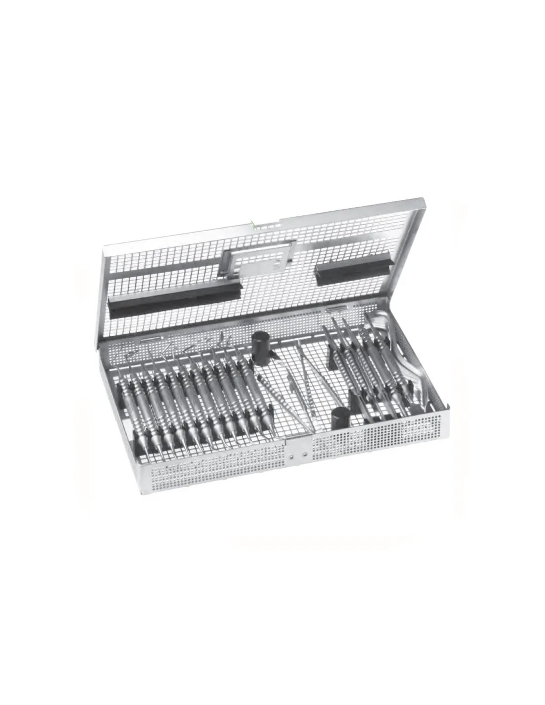 Todo presentado en una caja de esterilización (bandeja con tapa superior y asa) 9100-00 GPM. Fabricada en acero inoxidable con tiras de silicona para una firme sujeción de los instrumentos durante el lavado o almacenamiento. Sus grandes perforaciones garantizan una limpieza eficaz. Medidas: 275 x 180 x 35 mm.