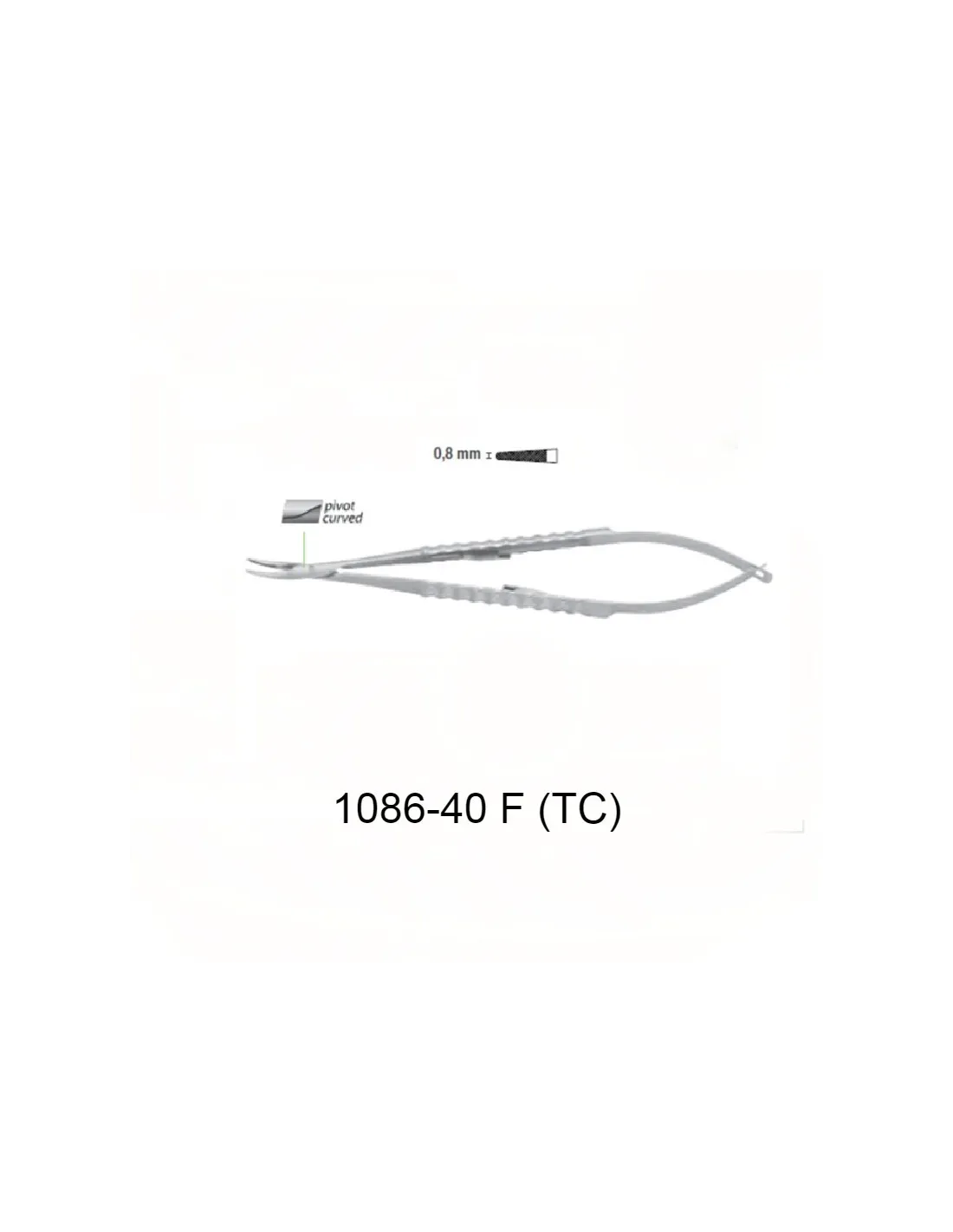 - 1086-40 F - Micro aguja soporte “Barraquer” 17,1 cm, TC, 0,8 mm, recto. Mango RS. Portaagujas para microagujas con bloqueo para cirugía mínimamente invasiva. Con carburo de tungstero. Se recomienda su uso con hilo de sutura: 5-0 y 8-0.